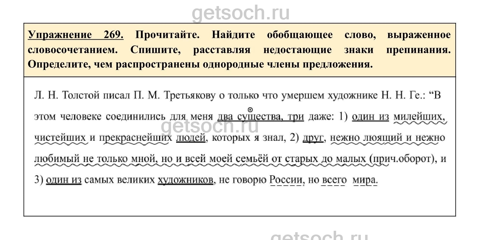 Упражнение 268. Найдите в каждом предложении однородные члены и укажите обобщающее слово. Чем оно выражено и какое место занимает по отношению к однородным членам? Спишите, расставляя пропущенные знаки препинания. Подчеркните обобщающие слова и однородные члены как члены предложения. Отметьте знаком обобщающие слова.