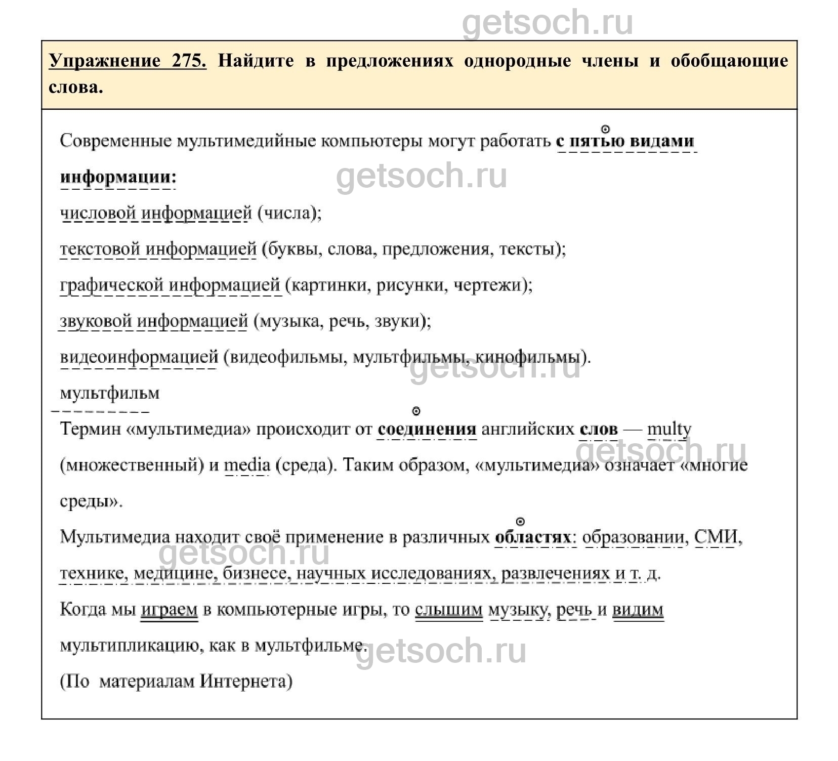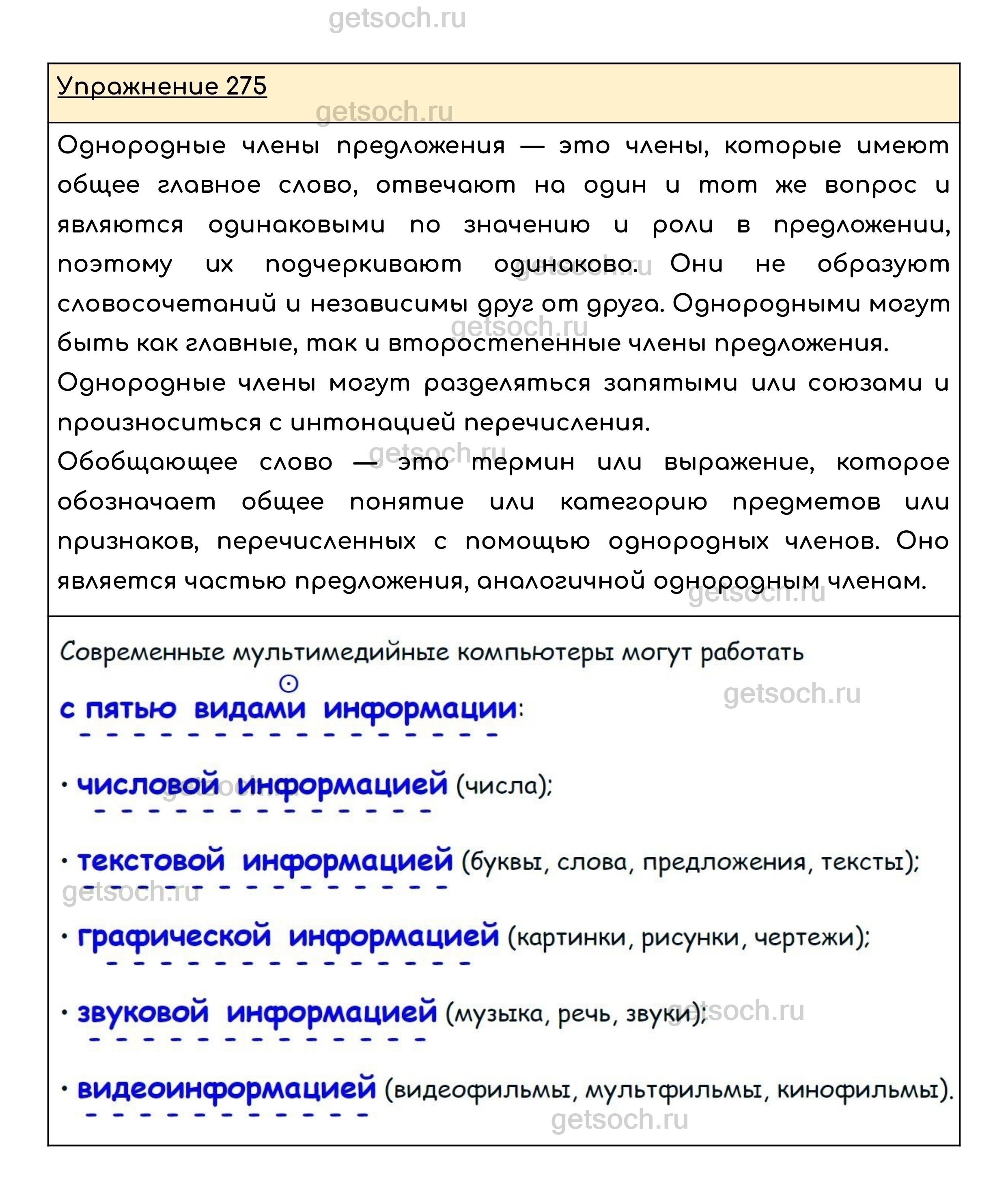 Упражнение 275. Найдите в предложениях однородные члены и обобщающие слова.