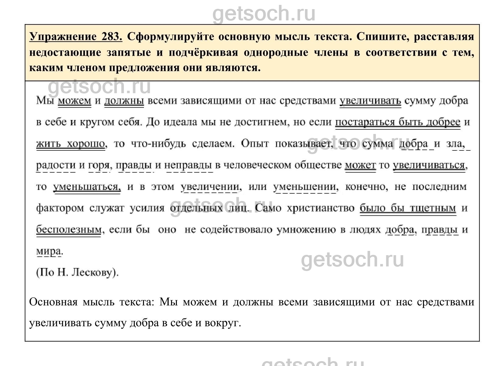 Упражнение 283. Сформулируйте основную мысль текста. Спишите, расставляя недостающие запятые и подчёркивая однородные члены в соответствии с тем, каким членом предложения они являются.