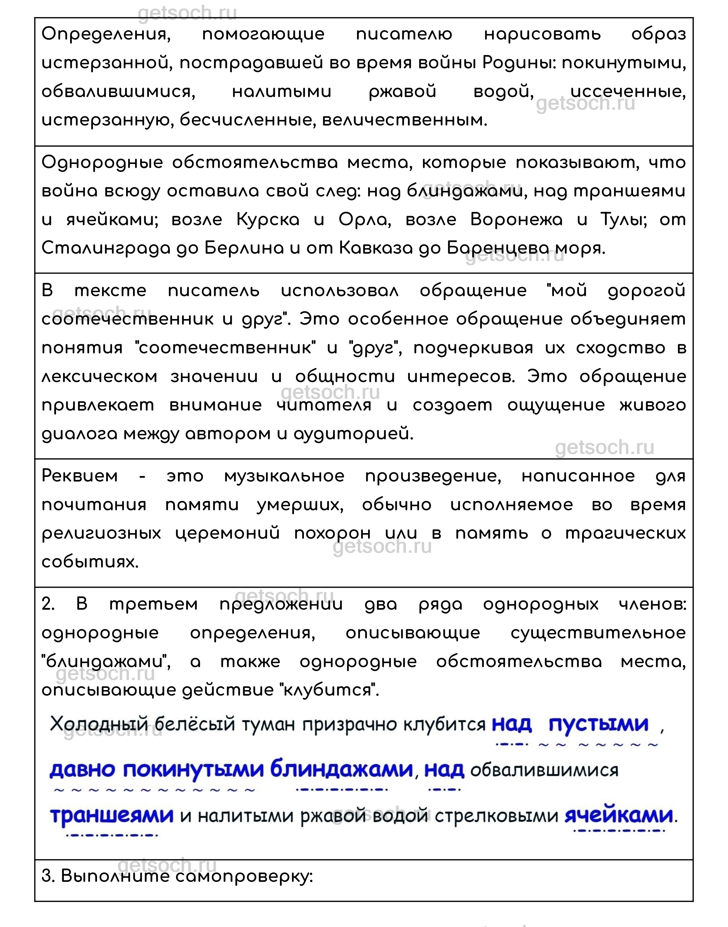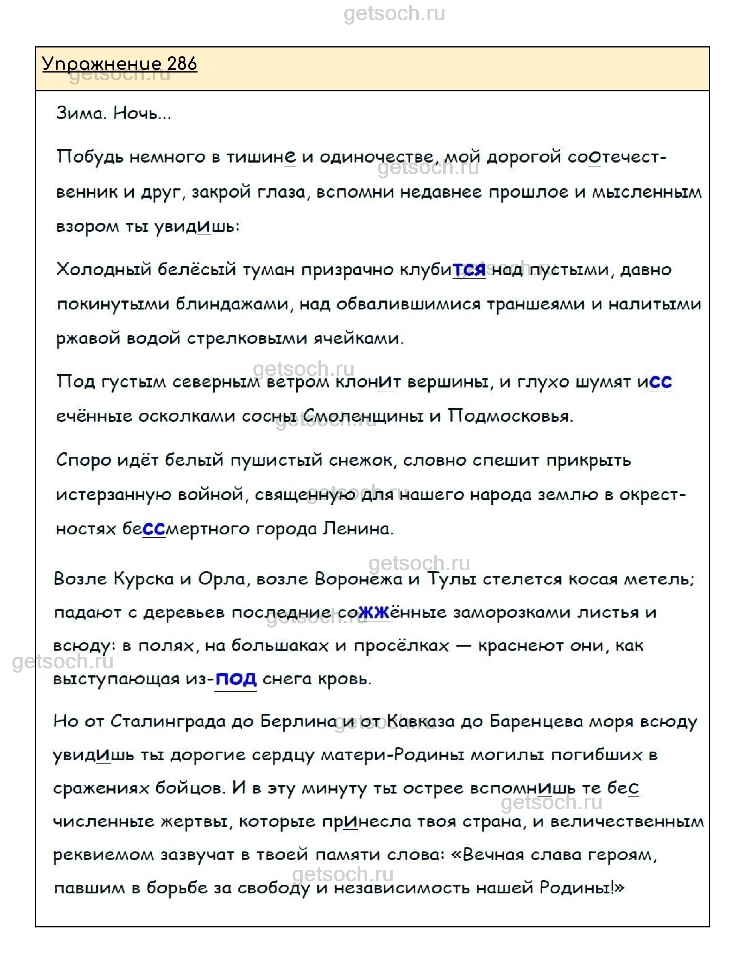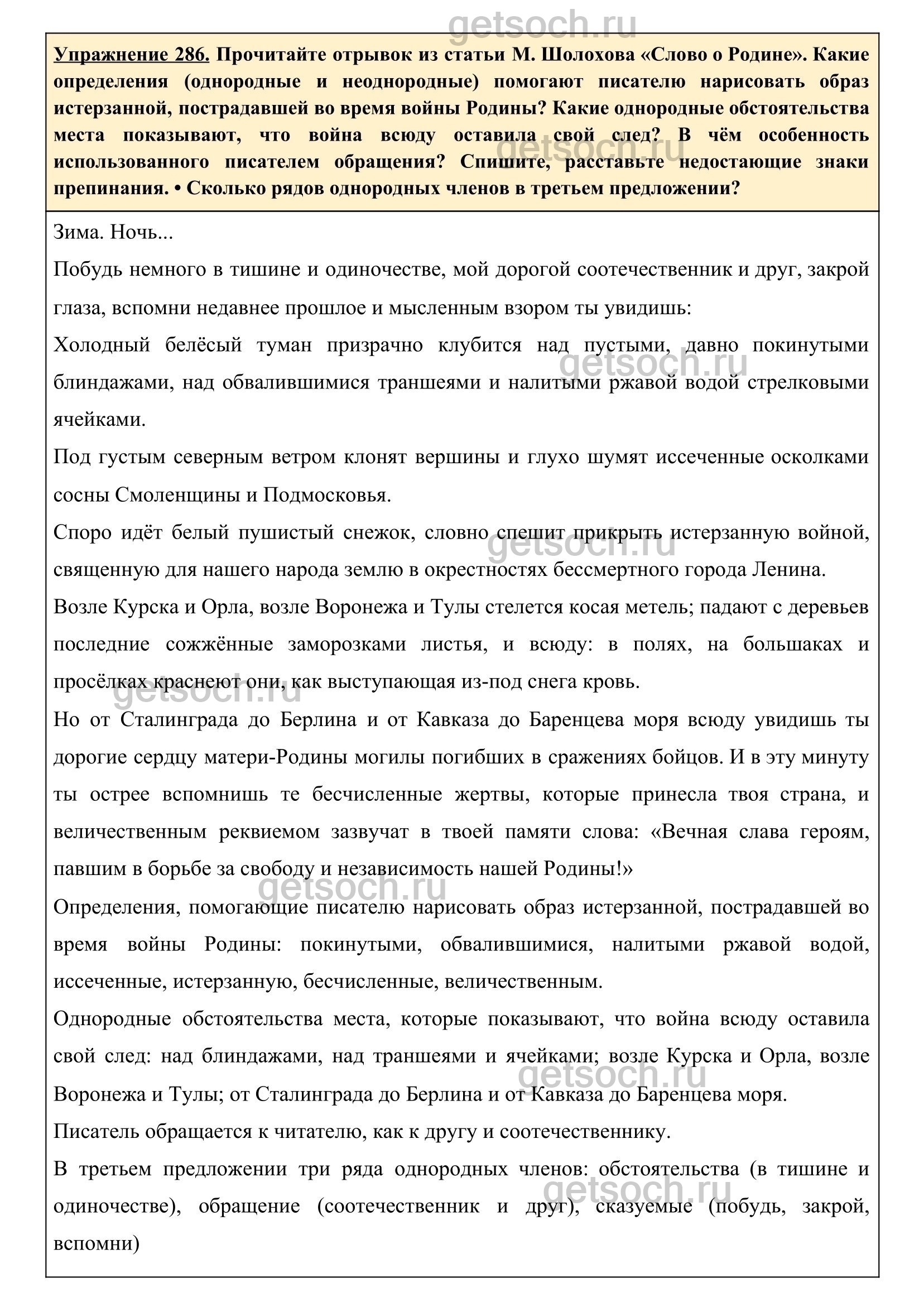Упражнение 286. Прочитайте отрывок из статьи М. Шолохова «Слово о Родине». Какие определения (однородные и неоднородные) помогают писателю нарисовать образ истерзанной, пострадавшей во время войны Родины? Какие однородные обстоятельства места показывают, что война всюду оставила свой след? В чём особенность использованного писателем обращения? Спишите, расставьте недостающие знаки препинания. • Сколько рядов однородных членов в третьем предложении?