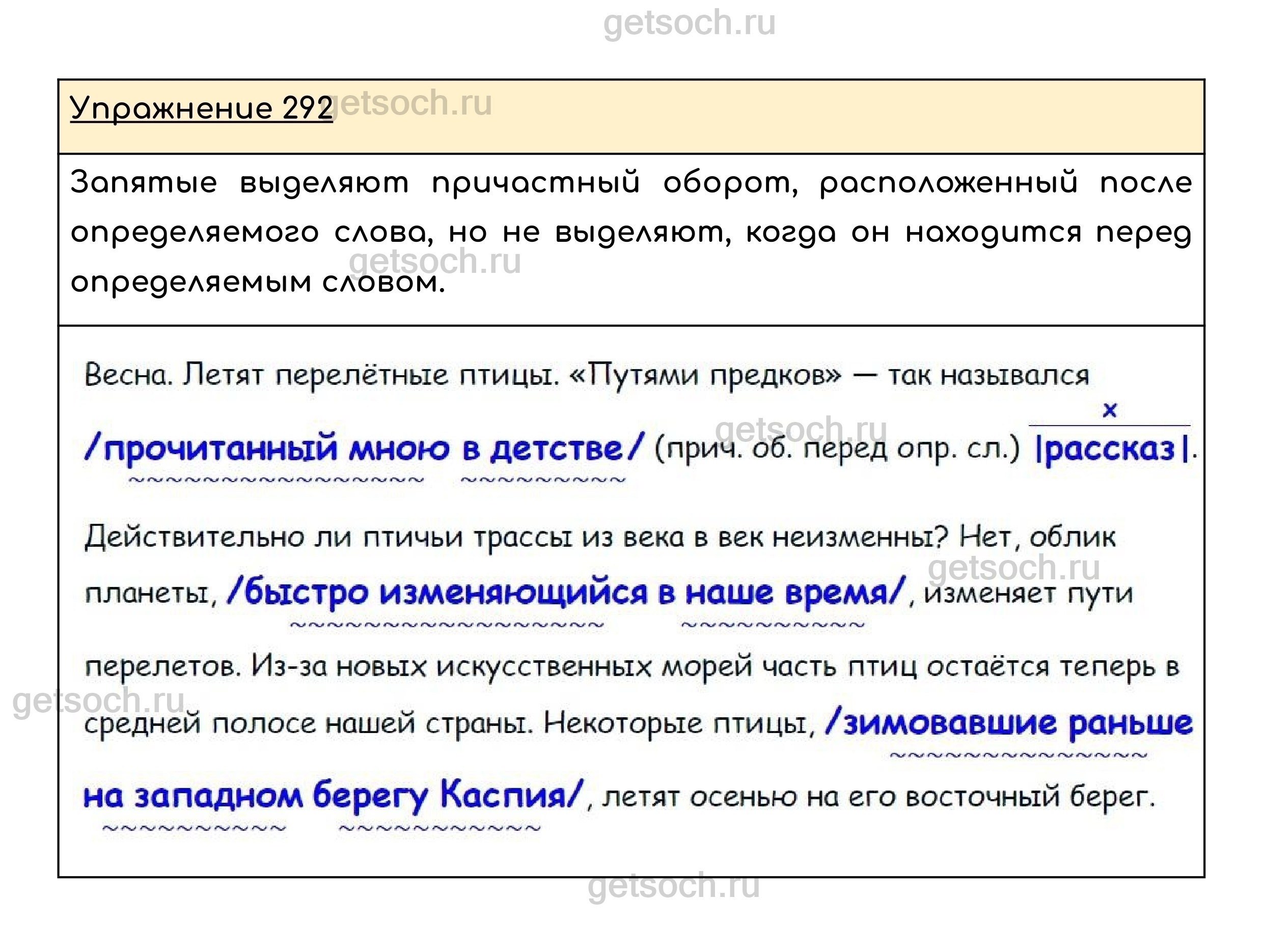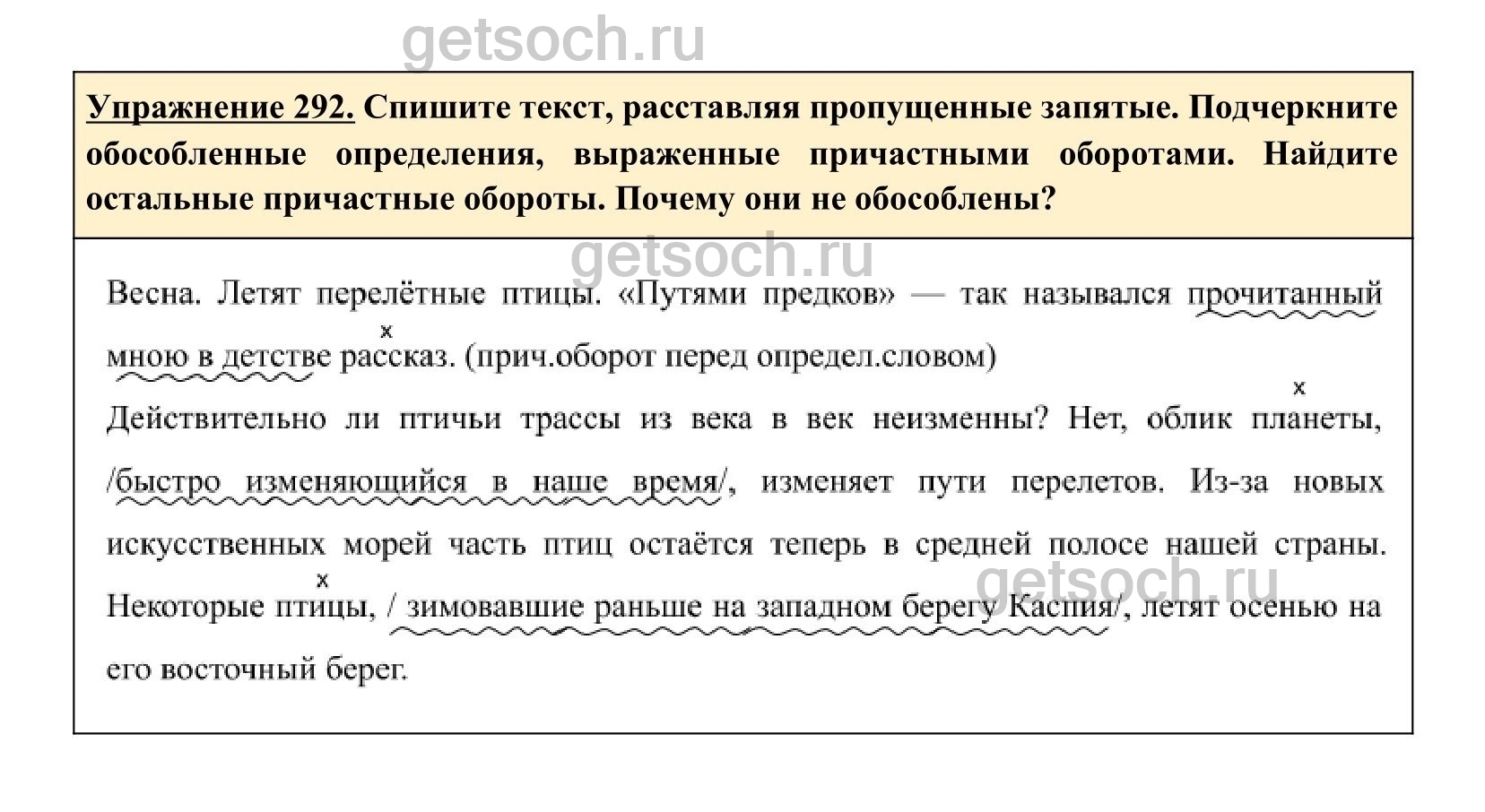 Упражнение 292. Спишите текст, расставляя пропущенные запятые. Подчеркните обособленные определения, выраженные причастными оборотами. Найдите остальные причастные обороты. Почему они не обособлены?