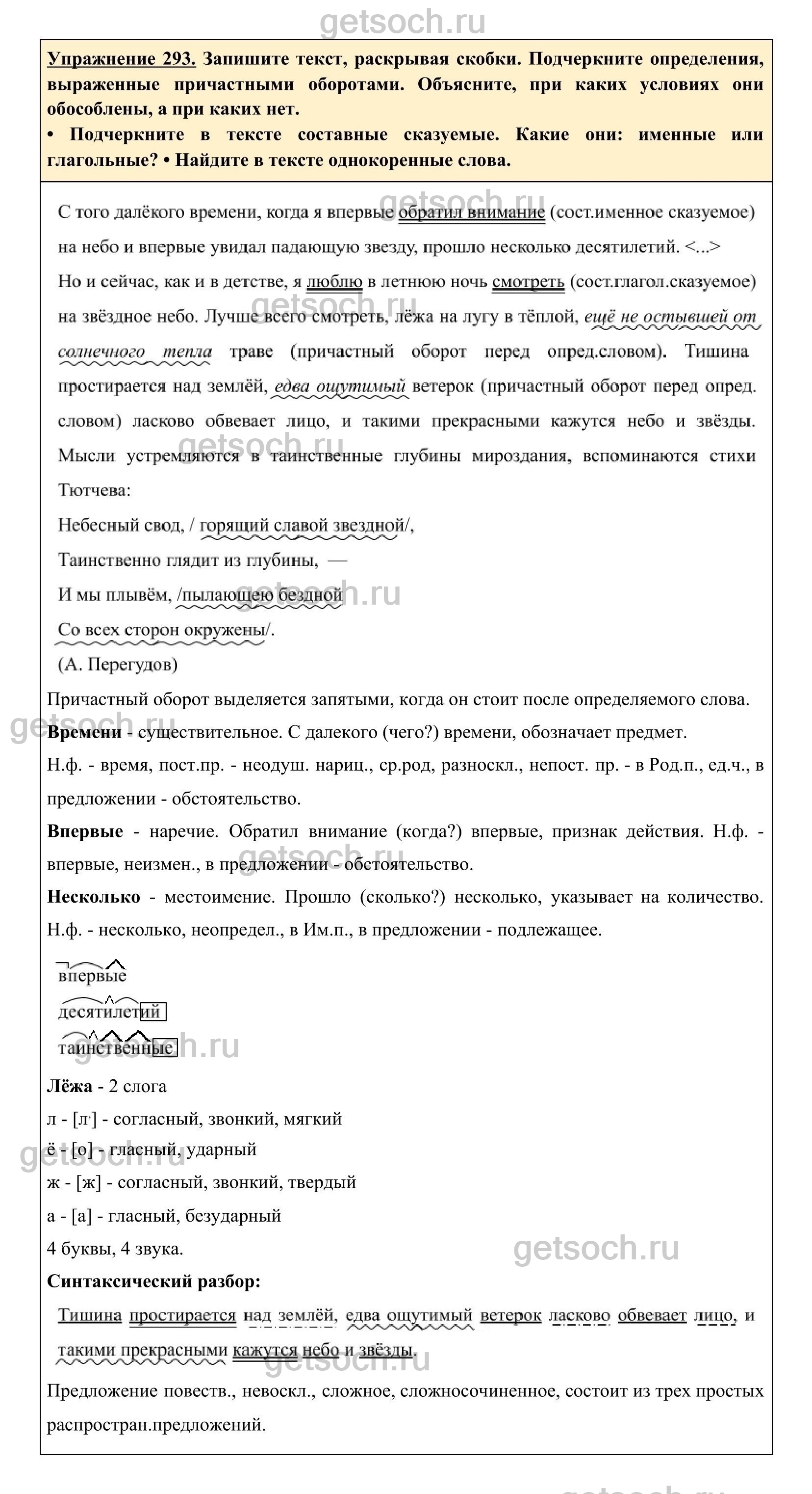 Упражнение 293. Запишите текст, раскрывая скобки. Подчеркните определения, выраженные причастными оборотами. Объясните, при каких условиях они обособлены, а при каких нет.