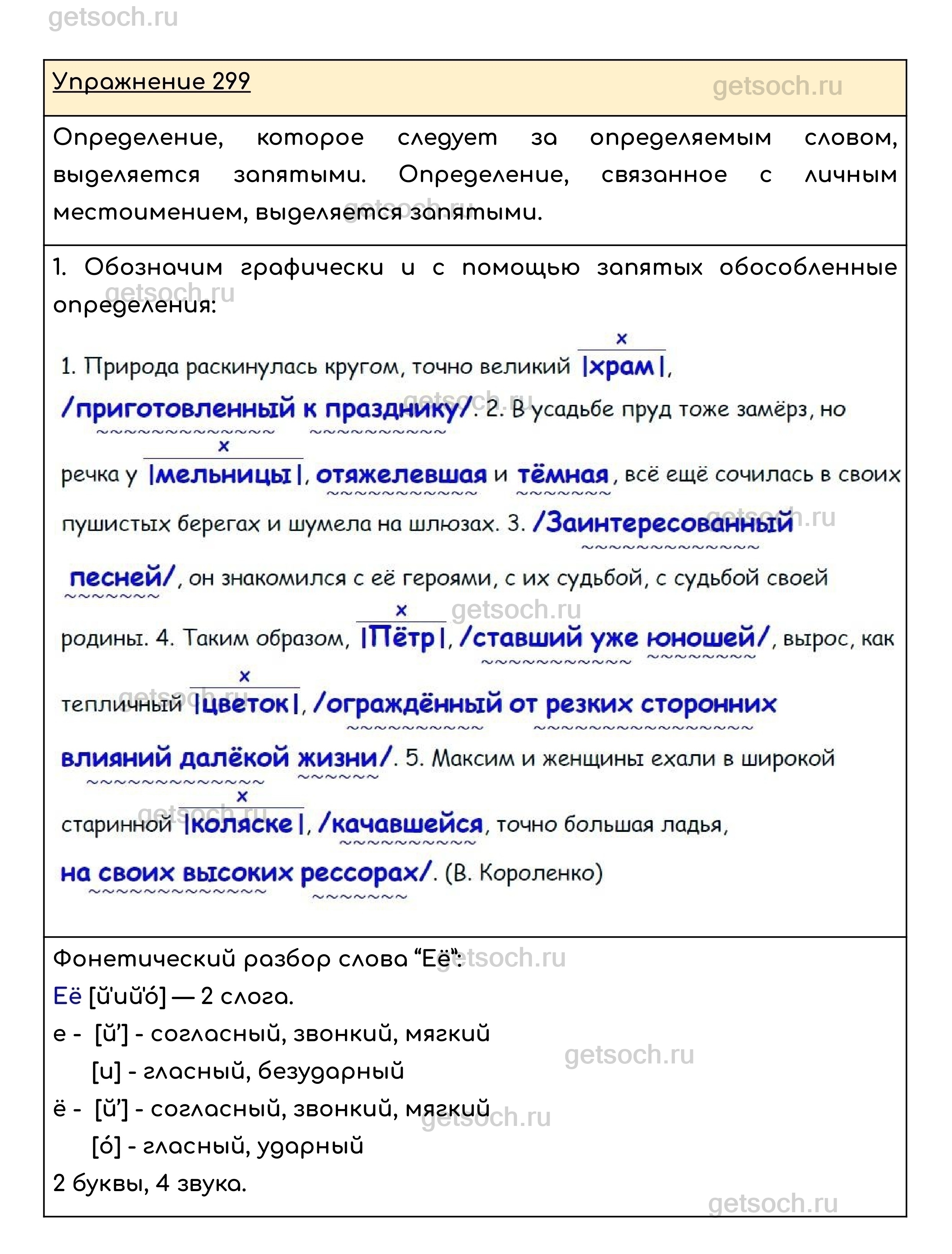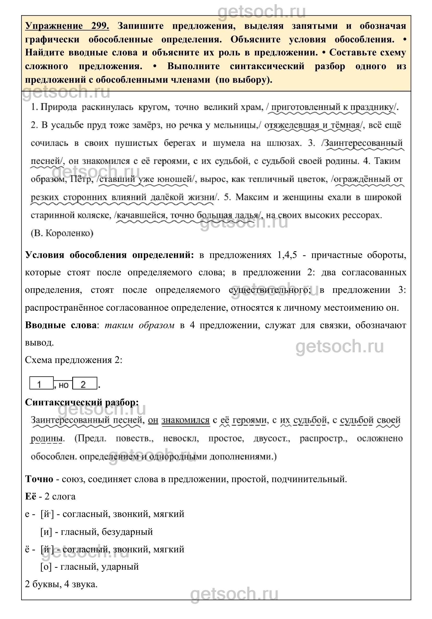 Упражнение 299. Запишите предложения, выделяя запятыми и обозначая графически обособленные определения. Объясните условия обособления. • Найдите вводные слова и объясните их роль в предложении. • Составьте схему сложного предложения. • Выполните синтаксический разбор одного из предложений с обособленными членами (по выбору).
