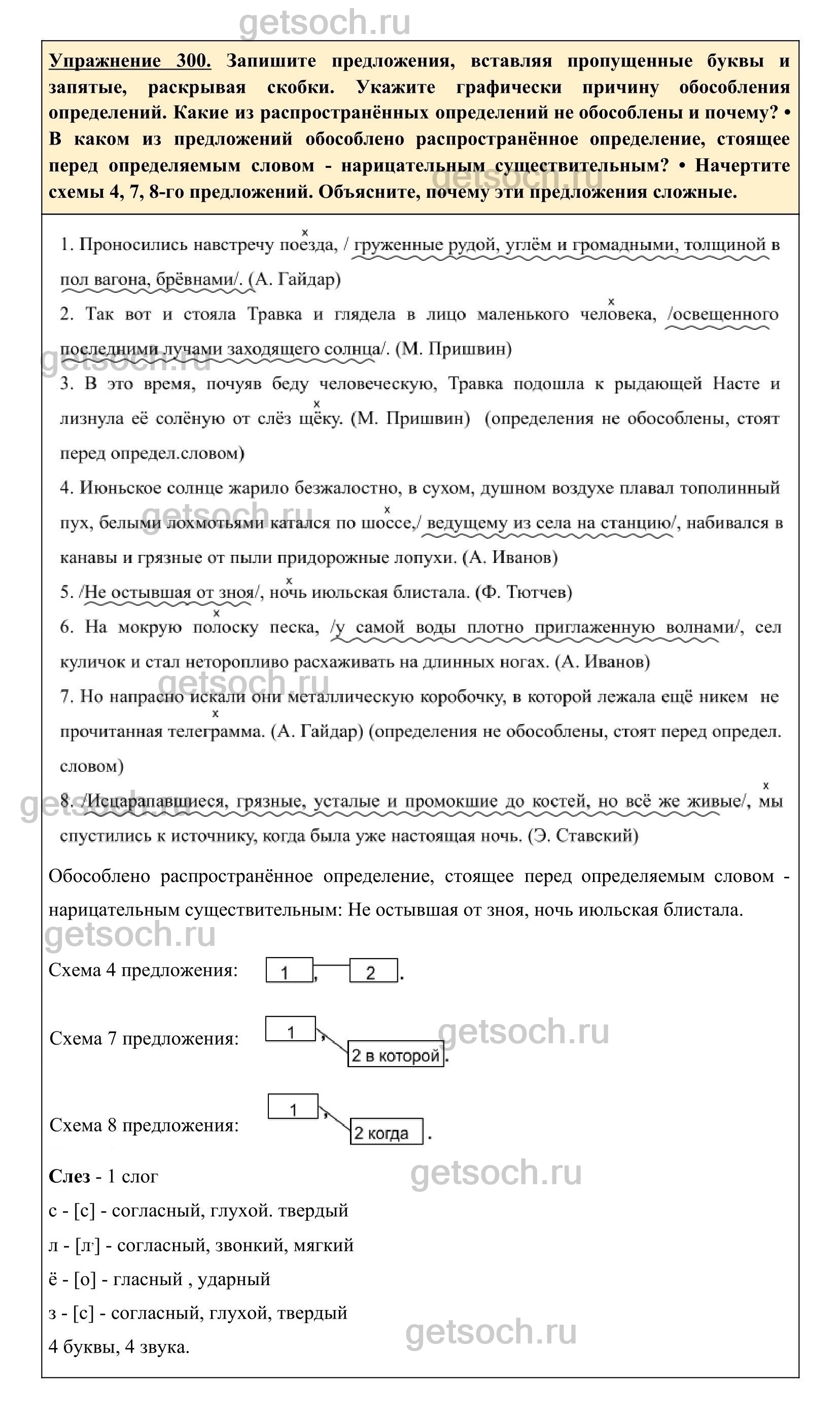 Упражнение 300. Запишите предложения, вставляя пропущенные буквы и запятые, раскрывая скобки. Укажите графически причину обособления определений. Какие из распространённых определений не обособлены и почему? • В каком из предложений обособлено распространённое определение, стоящее перед определяемым словом – нарицательным существительным? • Начертите схемы 4, 7, 8-го предложений. Объясните, почему эти предложения сложные.