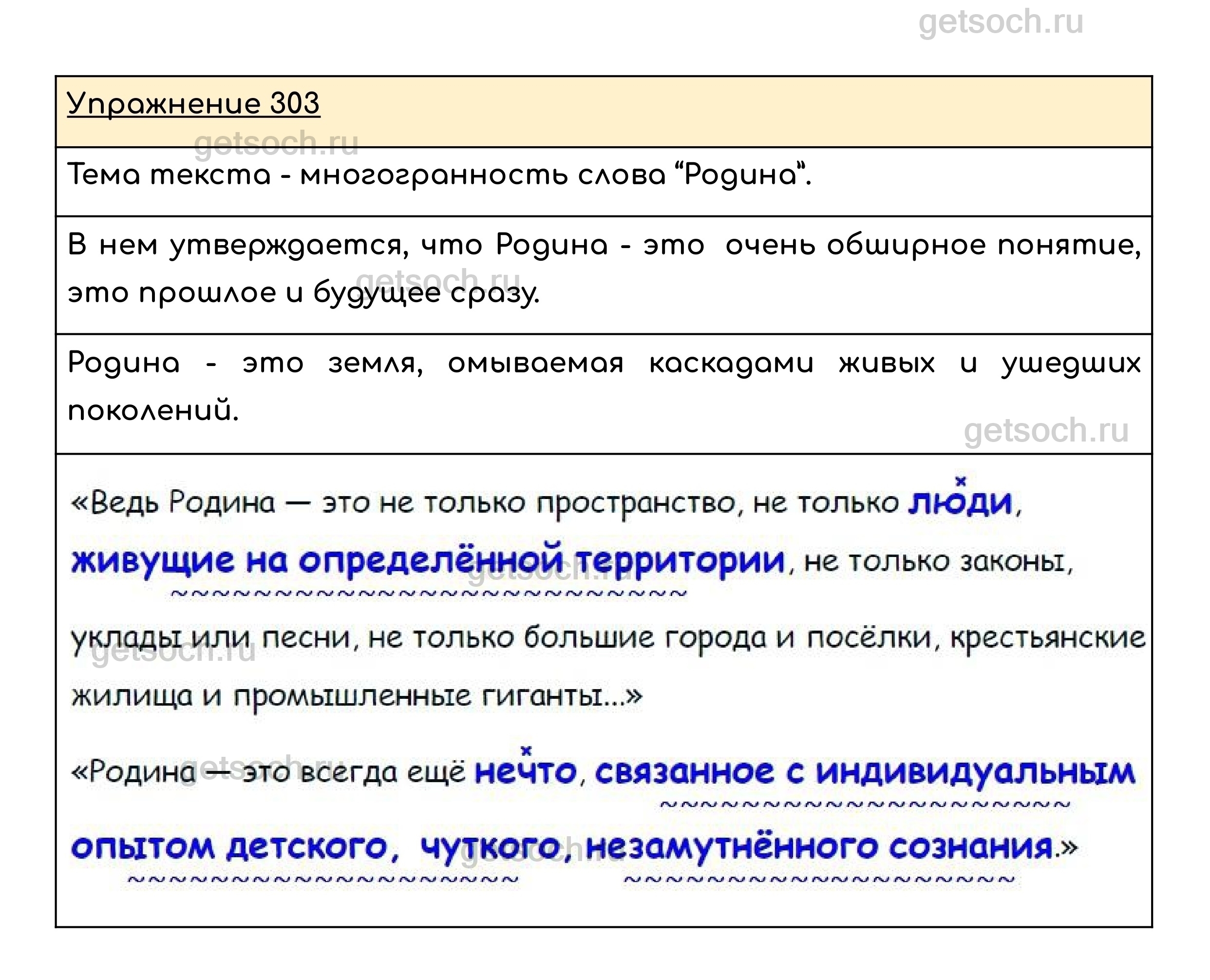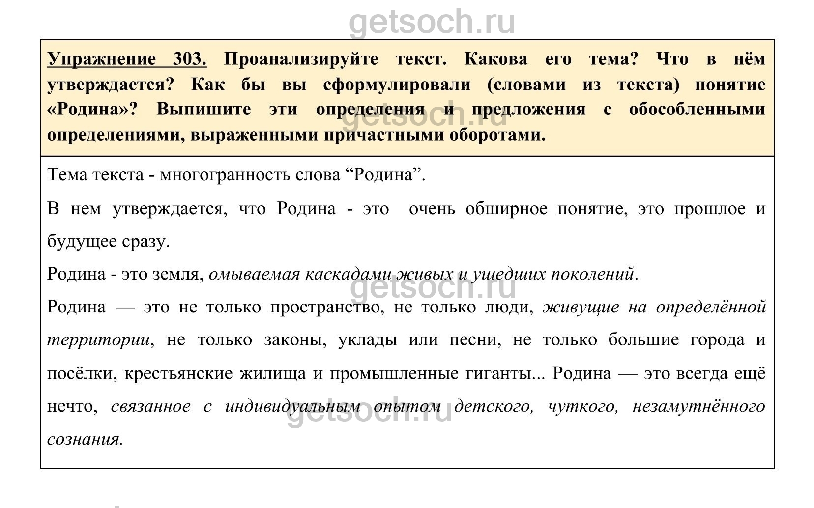 Упражнение 303. Проанализируйте текст. Какова его тема? Что в нём утверждается? Как бы вы сформулировали (словами из текста) понятие «Родина»? Выпишите эти определения и предложения с обособленными определениями, выраженными причастными оборотами.
