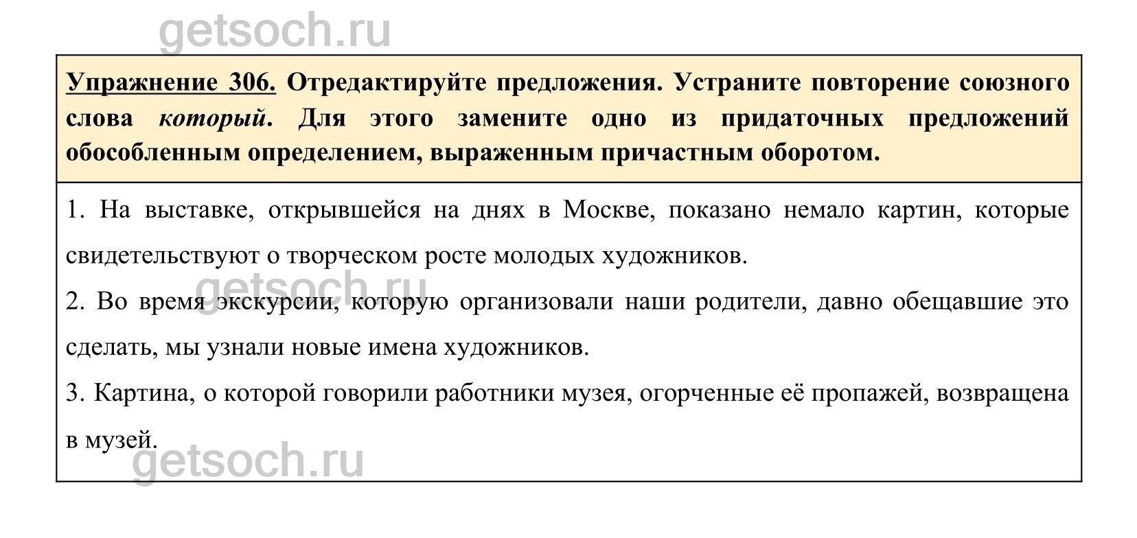 Упражнение 306. Отредактируйте предложения. Устраните повторение союзного слова который. Для этого замените одно из придаточных предложений обособленным определением, выраженным причастным оборотом.
