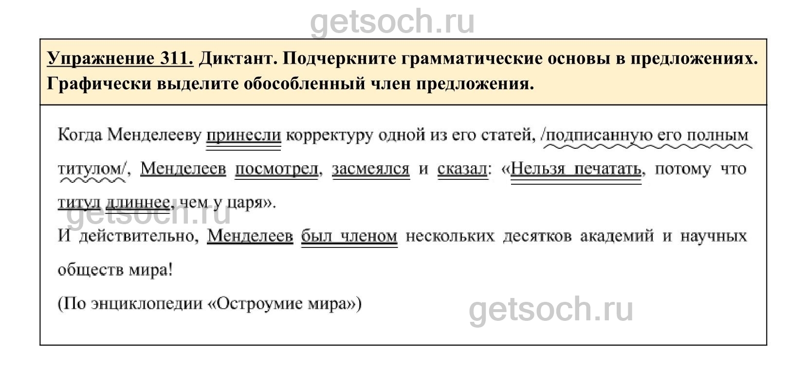 Упражнение 311. Диктант. Подчеркните грамматические основы в предложениях. Графически выделите обособленный член предложения.