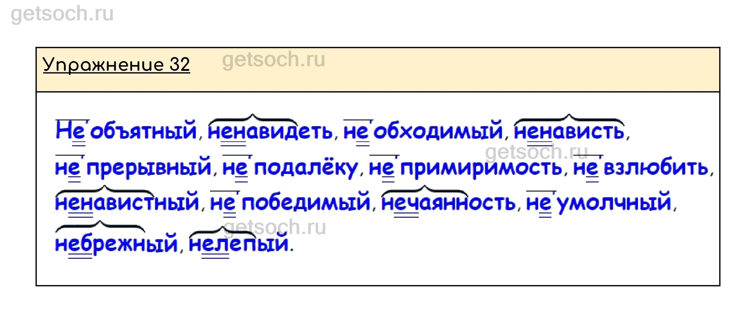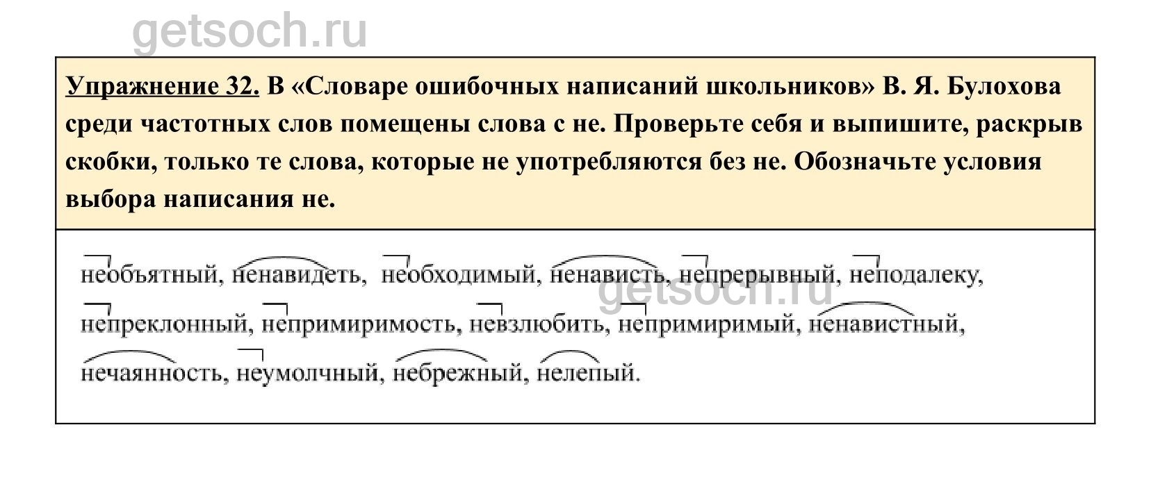Упражнение 32. В «Словаре ошибочных написаний школьников» В. Я. Булохова среди частотных слов помещены слова с не. Проверьте себя и выпишите, раскрыв скобки, только те слова, которые не употребляются без не. Обозначьте условия выбора написания не.