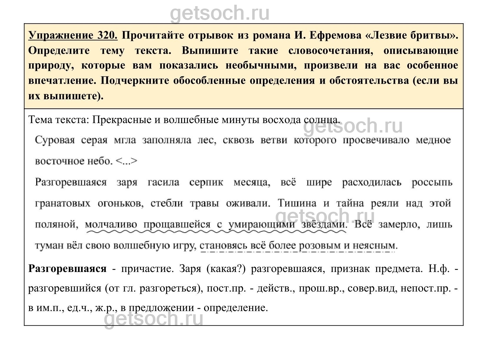 Упражнение 320. Прочитайте отрывок из романа И. Ефремова «Лезвие бритвы». Определите тему текста. Выпишите такие словосочетания, описывающие природу, которые вам показались необычными, произвели на вас особенное впечатление. Подчеркните обособленные определения и обстоятельства (если вы их выпишете).