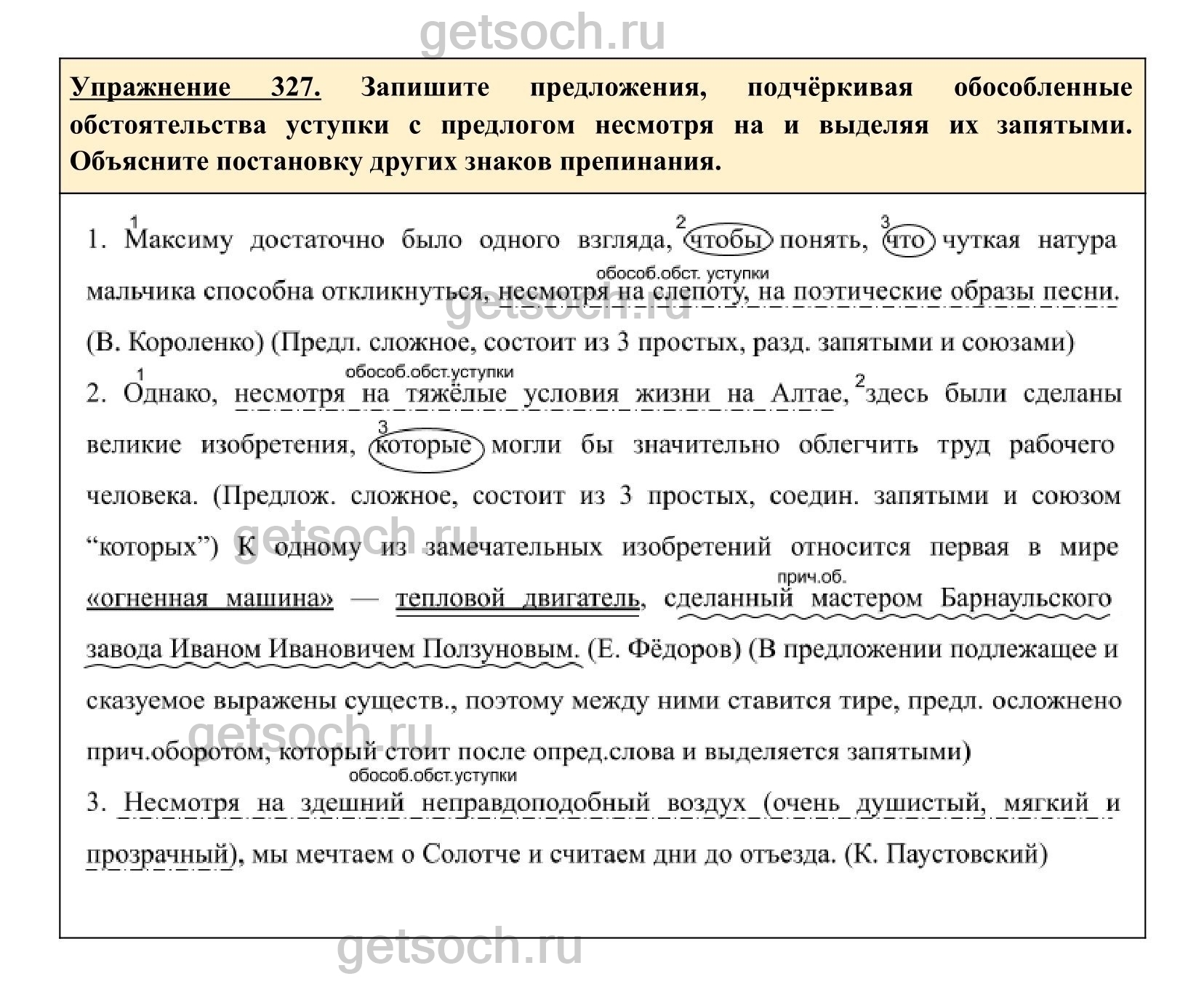 Упражнение 327. Запишите предложения, подчёркивая обособленные обстоятельства уступки с предлогом несмотря на и выделяя их запятыми. Объясните постановку других знаков препинания.