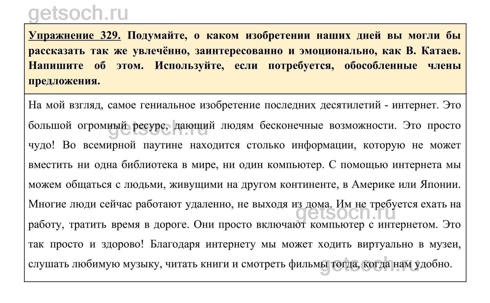 Упражнение 329. Подумайте, о каком изобретении наших дней вы могли бы рассказать так же увлечённо, заинтересованно и эмоционально, как В. Катаев. Напишите об этом. Используйте, если потребуется, обособленные члены предложения.