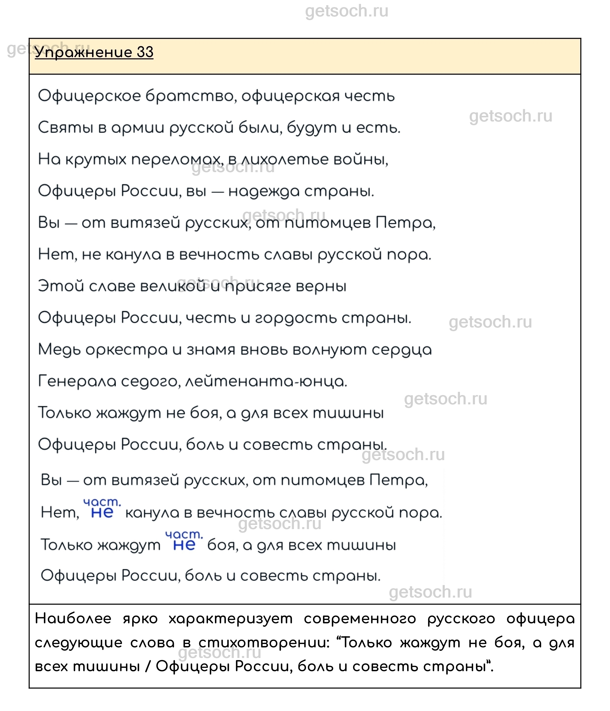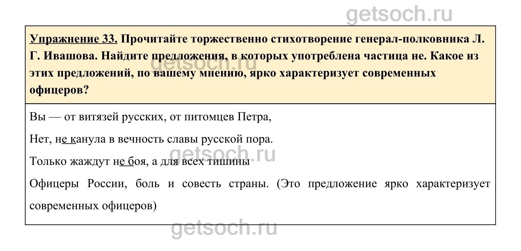 Упражнение 33. Прочитайте торжественно стихотворение генерал-полковника Л. Г. Ивашова. Найдите предложения, в которых употреблена частица не. Какое из этих предложений, по вашему мнению, ярко характеризует современных офицеров?