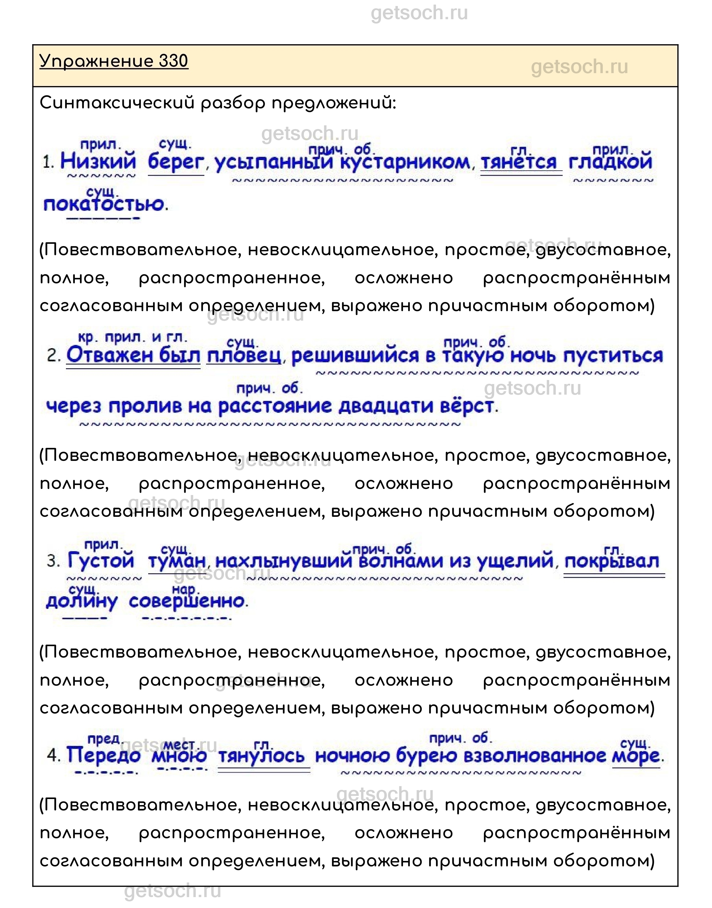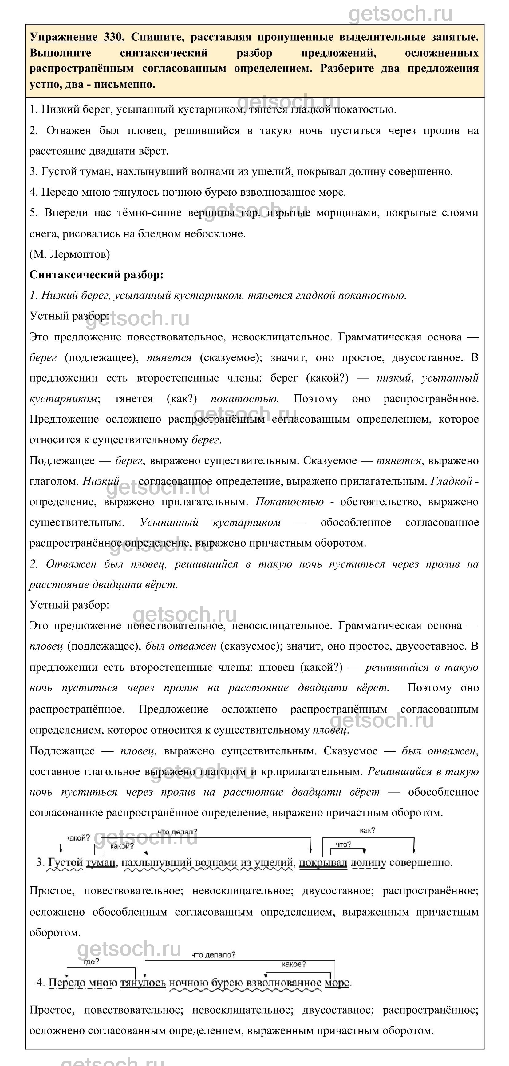 Упражнение 330. Спишите, расставляя пропущенные выделительные запятые. Выполните синтаксический разбор предложений, осложненных распространённым согласованным определением. Разберите два предложения устно, два – письменно.