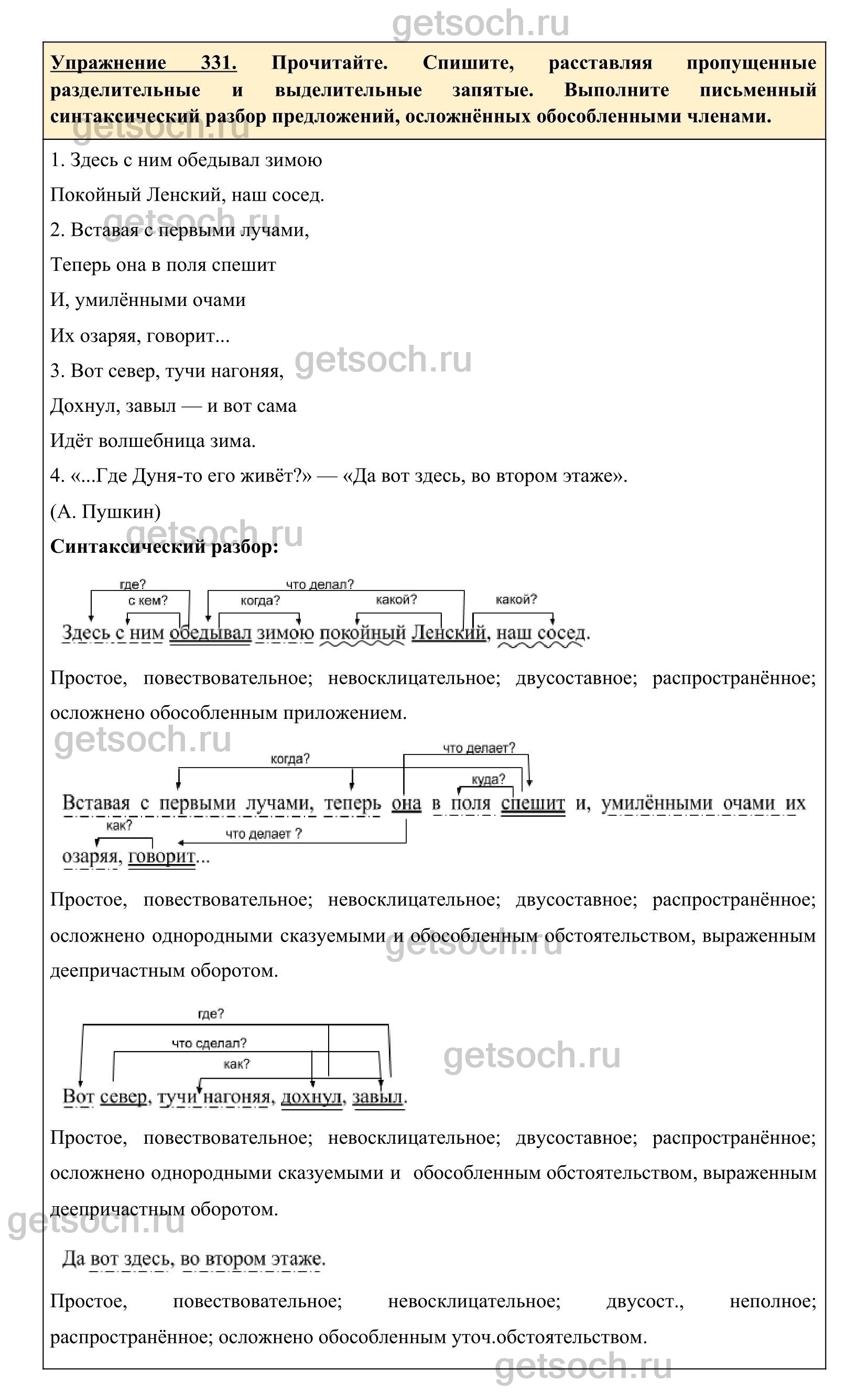 Упражнение 331. Прочитайте. Спишите, расставляя пропущенные разделительные и выделительные запятые. Выполните письменный синтаксический разбор предложений, осложнённых обособленными членами.