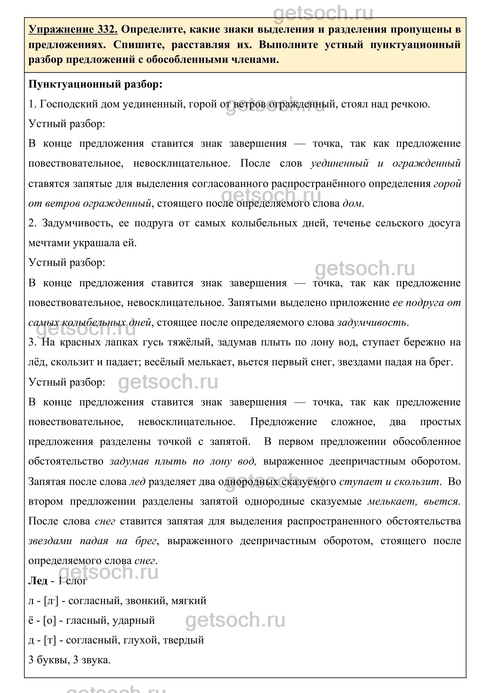 Упражнение 332. Определите, какие знаки выделения и разделения пропущены в предложениях. Спишите, расставляя их. Выполните устный пунктуационный разбор предложений с обособленными членами.
