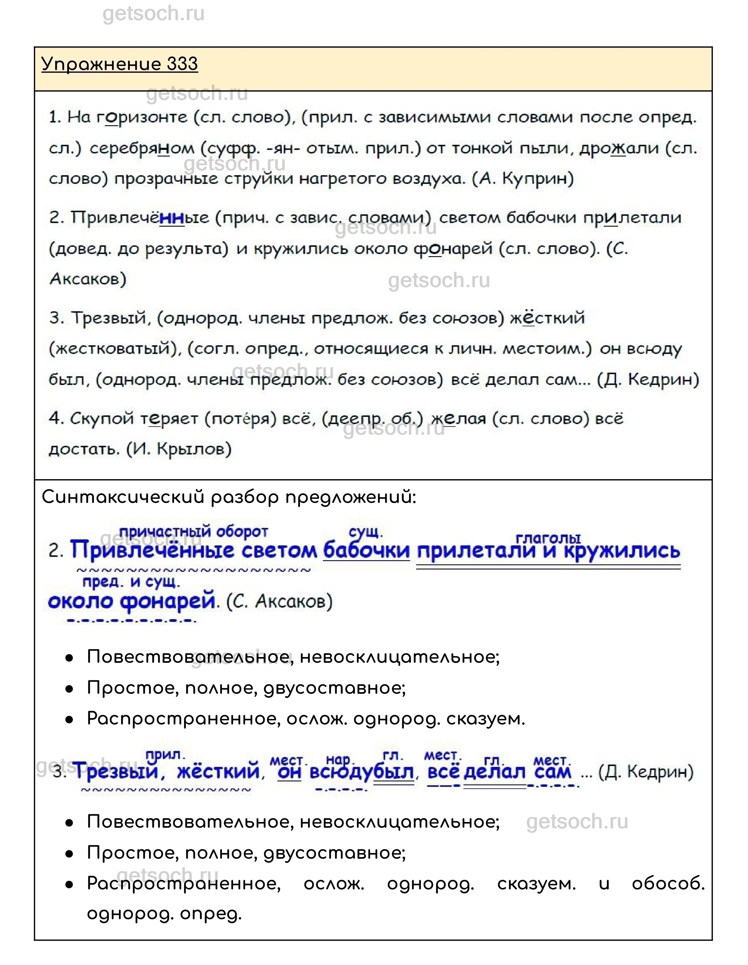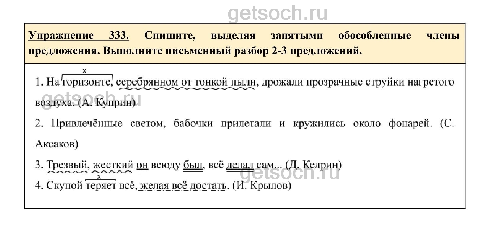 Упражнение 333. Спишите, выделяя запятыми обособленные члены предложения. Выполните письменный разбор 2-3 предложений.