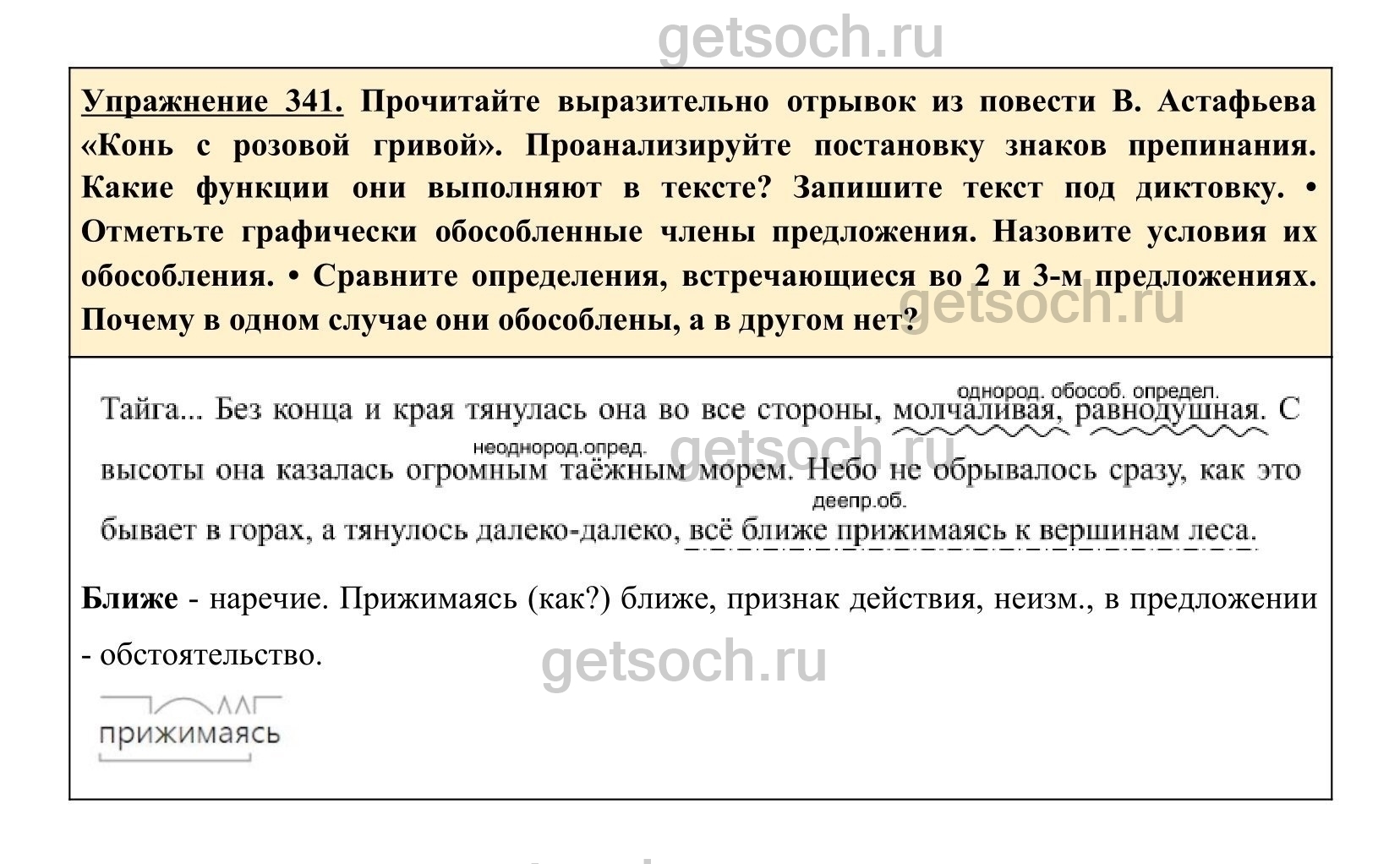 Упражнение 341. Прочитайте выразительно отрывок из повести В. Астафьева «Конь с розовой гривой». Проанализируйте постановку знаков препинания. Какие функции они выполняют в тексте? Запишите текст под диктовку. • Отметьте графически обособленные члены предложения. Назовите условия их обособления. • Сравните определения, встречающиеся во 2 и 3-м предложениях. Почему в одном случае они обособлены, а в другом нет?