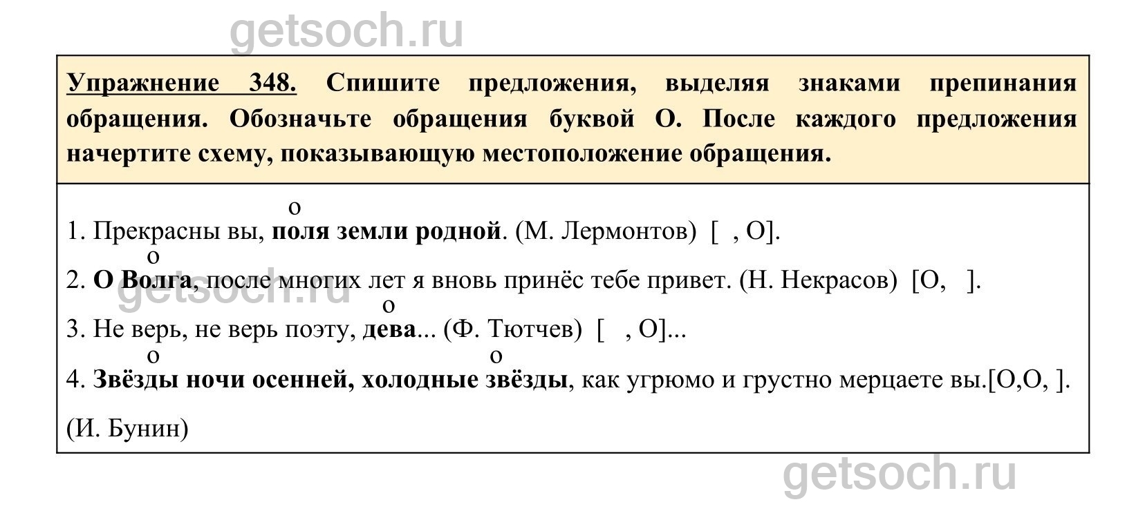 Упражнение 348. Спишите предложения, выделяя знаками препинания обращения. Обозначьте обращения буквой О. После каждого предложения начертите схему, показывающую местоположение обращения.