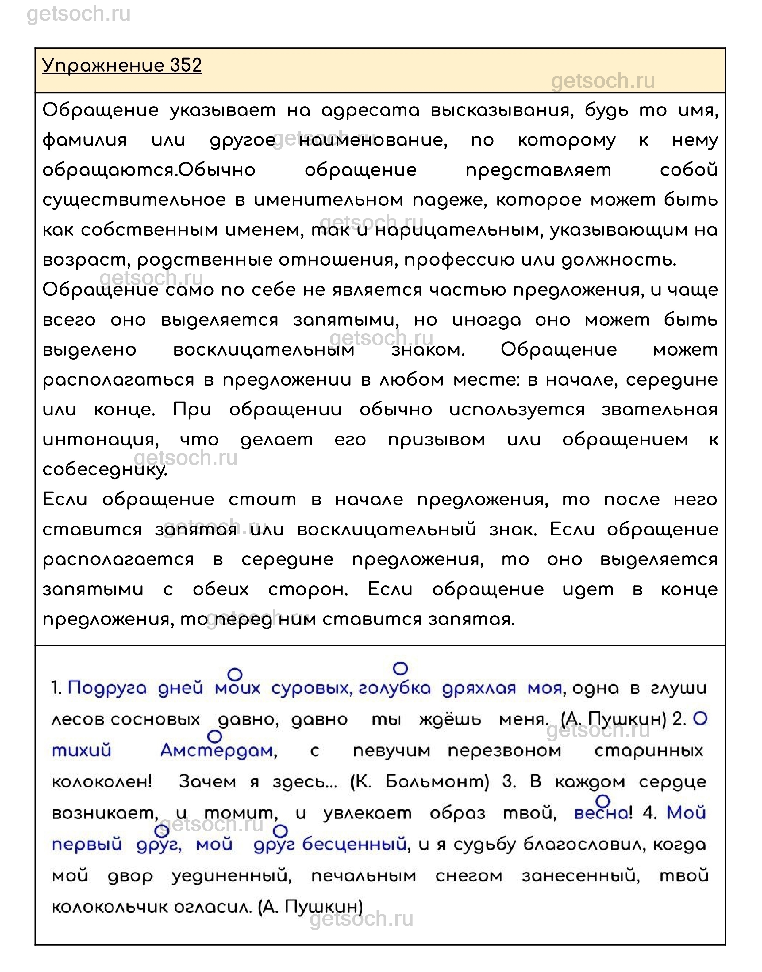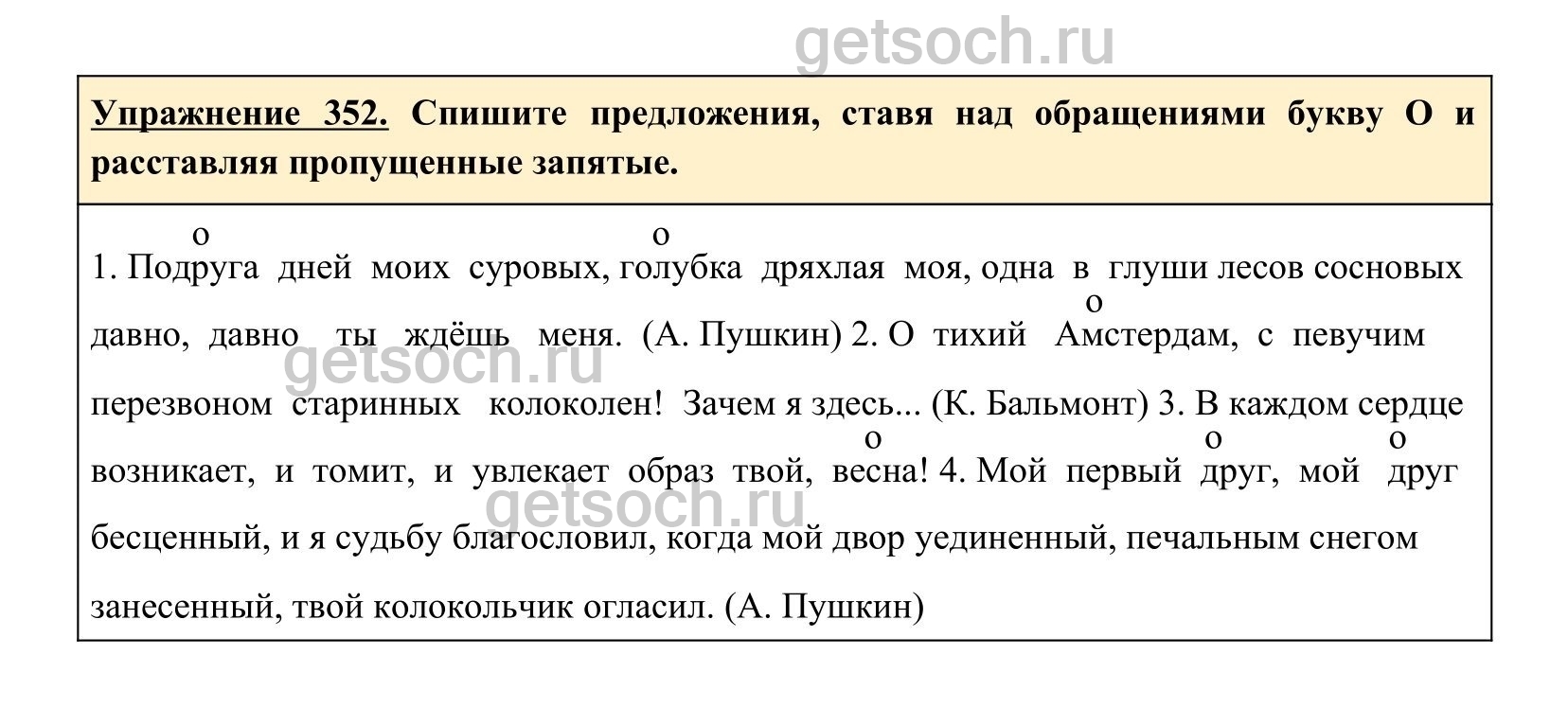 Упражнение 352. Спишите предложения, ставя над обращениями букву О и расставляя пропущенные запятые.