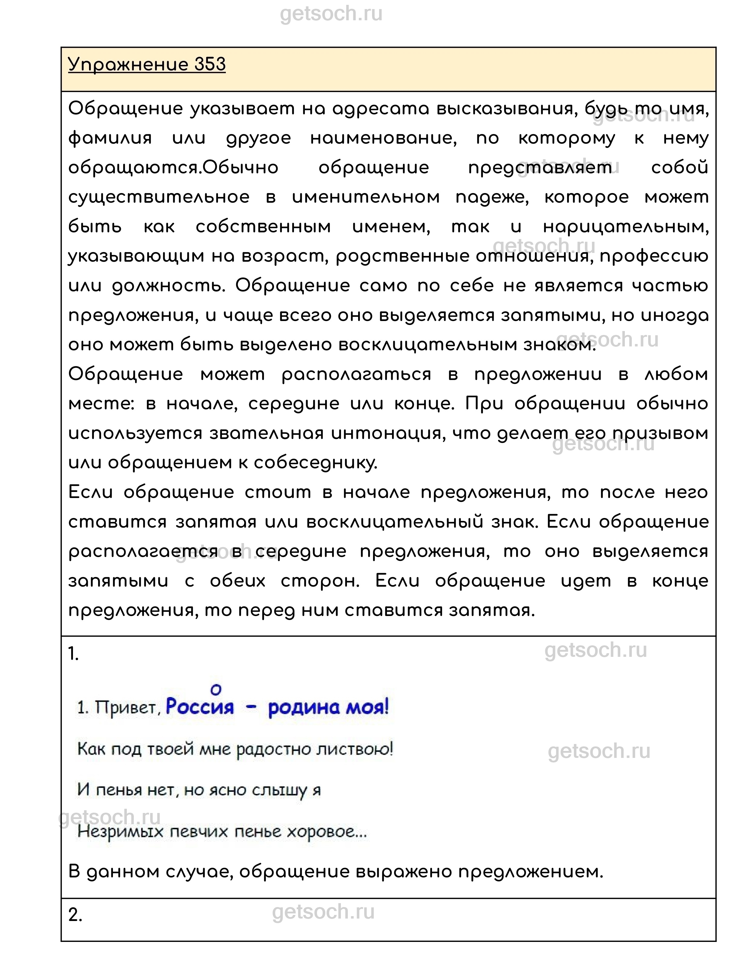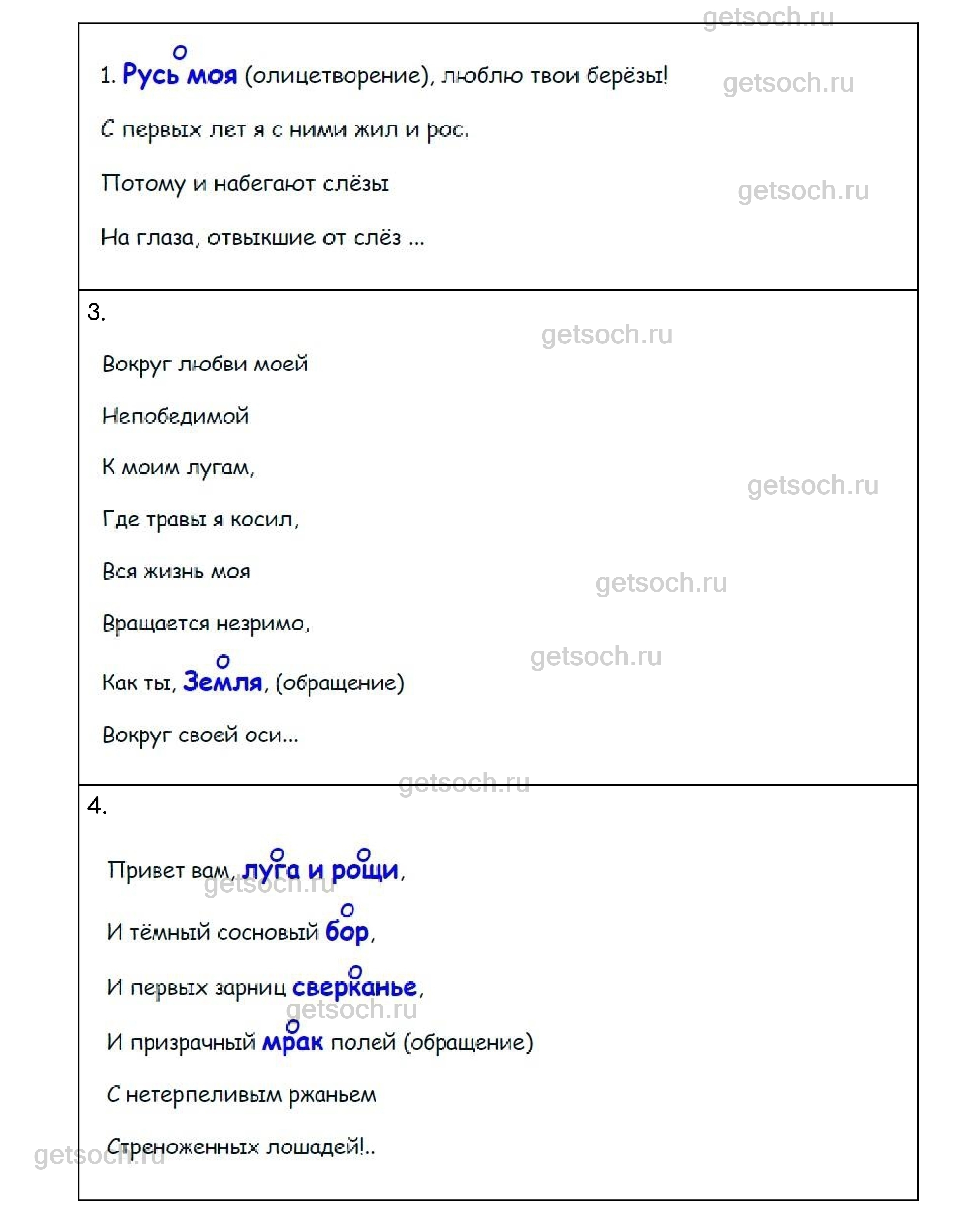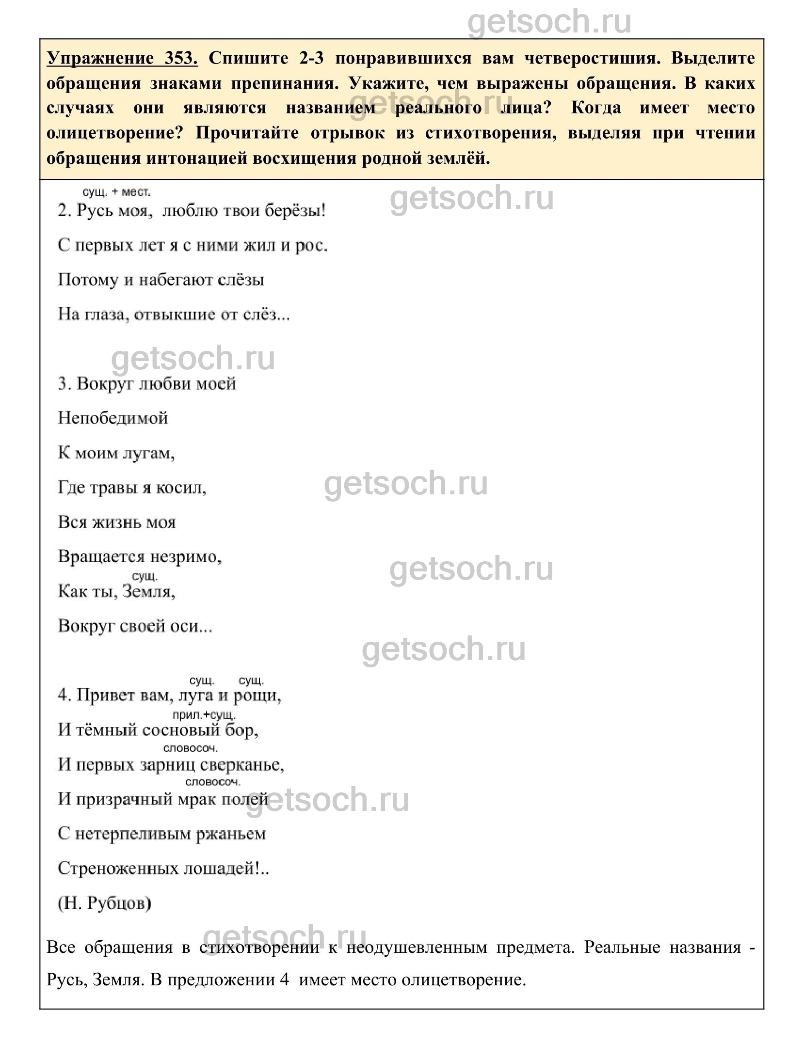 Упражнение 353. Спишите 2-3 понравившихся вам четверостишия. Выделите обращения знаками препинания. Укажите, чем выражены обращения. В каких случаях они являются названием реального лица? Когда имеет место олицетворение? Прочитайте отрывок из стихотворения, выделяя при чтении обращения интонацией восхищения родной землёй.
