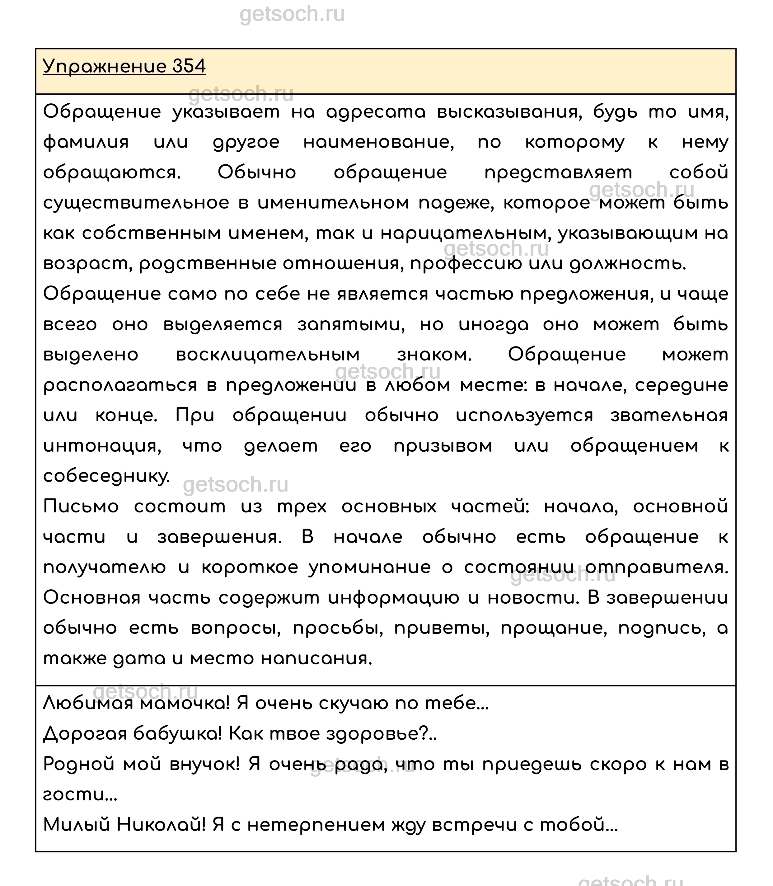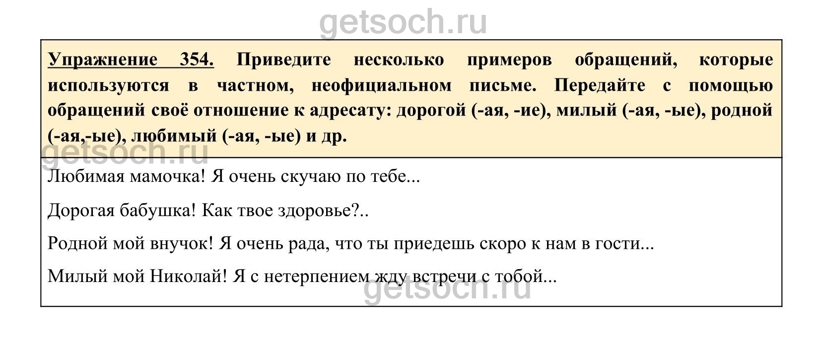 Упражнение 354. Приведите несколько примеров обращений, которые используются в частном, неофициальном письме. Передайте с помощью обращений своё отношение к адресату: дорогой (-ая, -ие), милый (-ая, -ые), родной (-ая,-ые), любимый (-ая, -ые) и др.