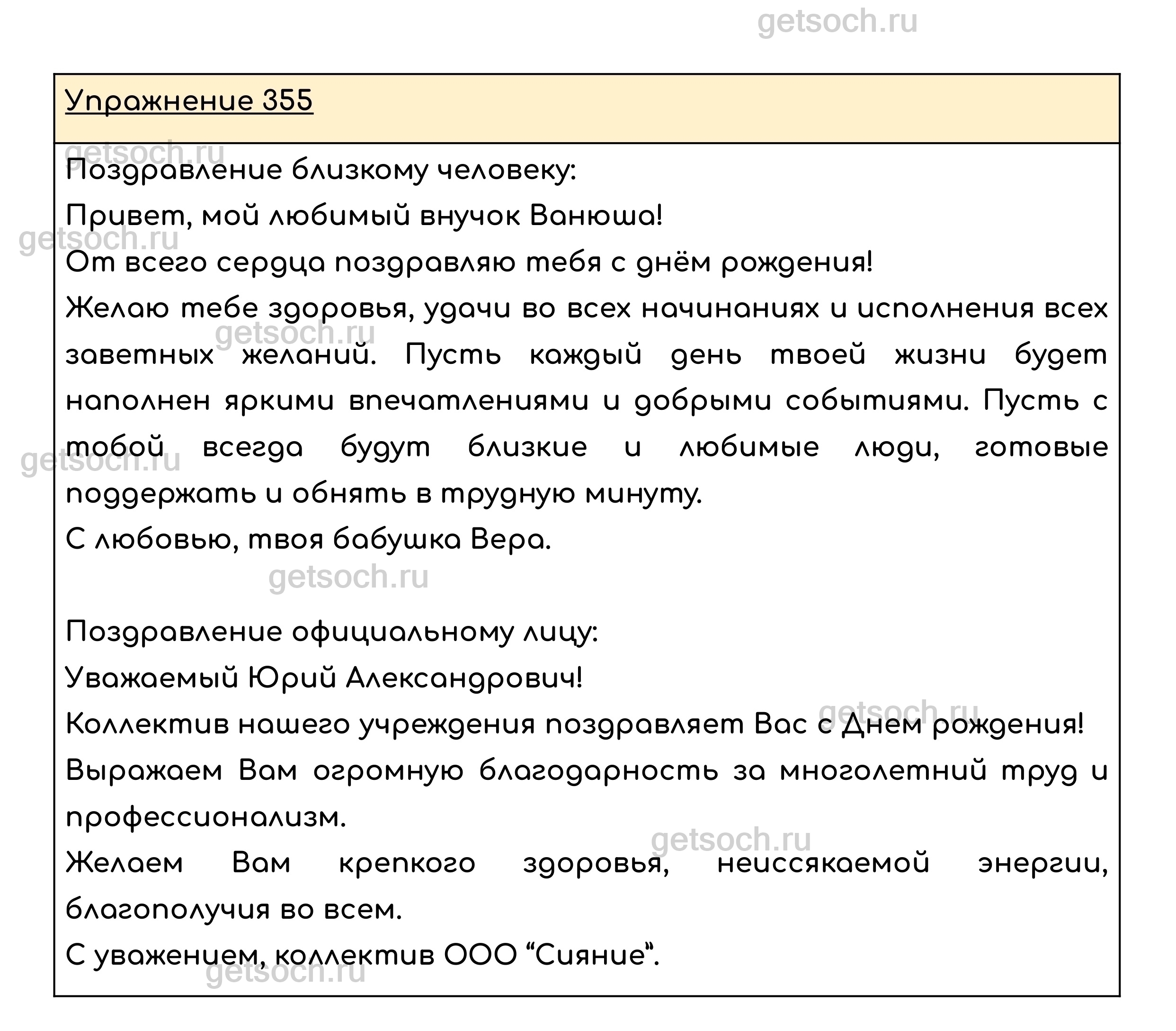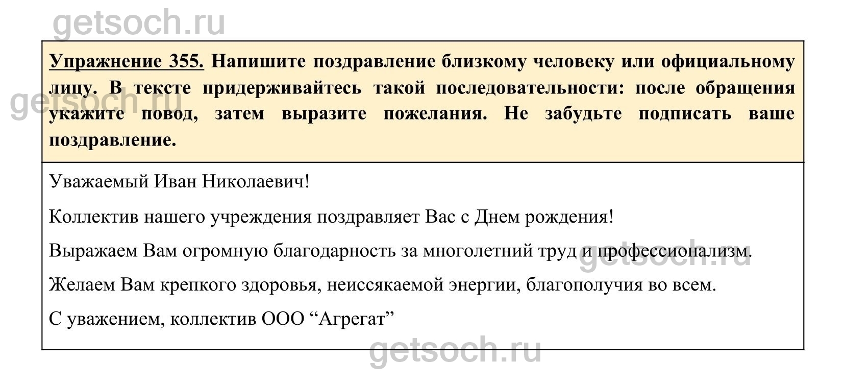 Упражнение 355. Напишите поздравление близкому человеку или официальному лицу. В тексте придерживайтесь такой последовательности: после обращения укажите повод, затем выразите пожелания. Не забудьте подписать ваше поздравление.