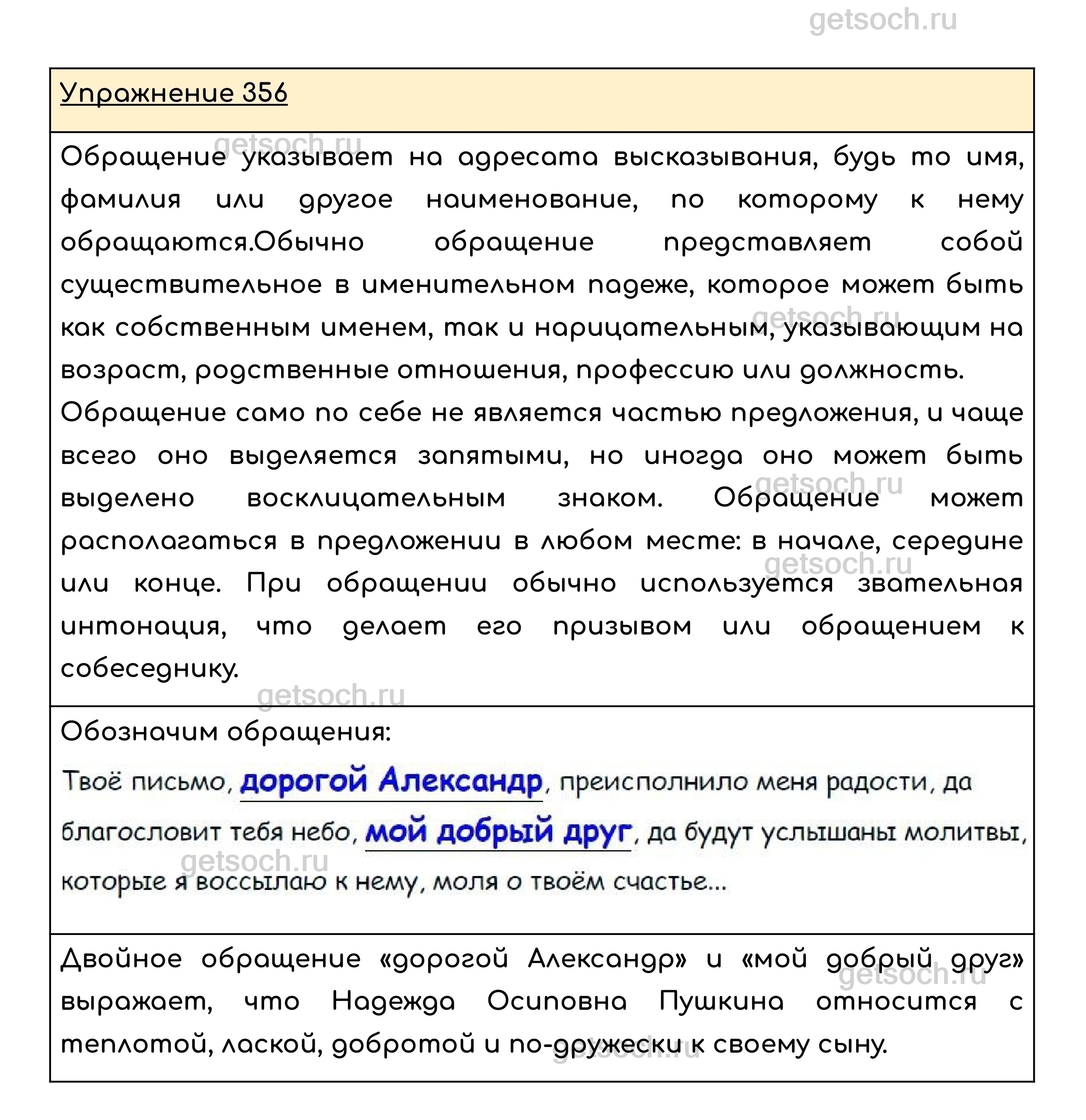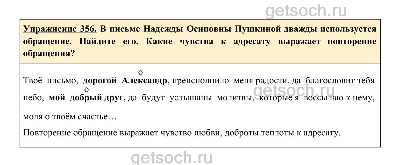 Упражнение 356. В письме Надежды Осиповны Пушкиной дважды используется обращение. Найдите его. Какие чувства к адресату выражает повторение обращения?