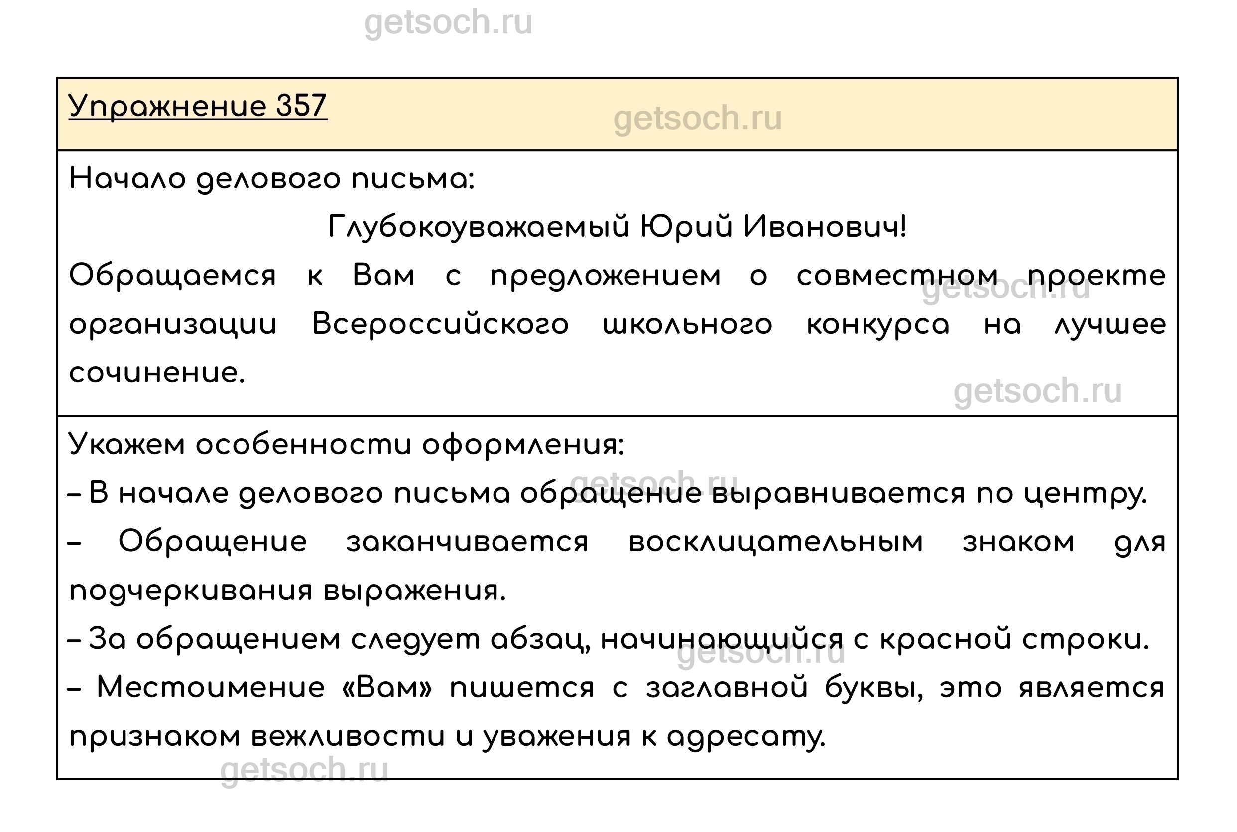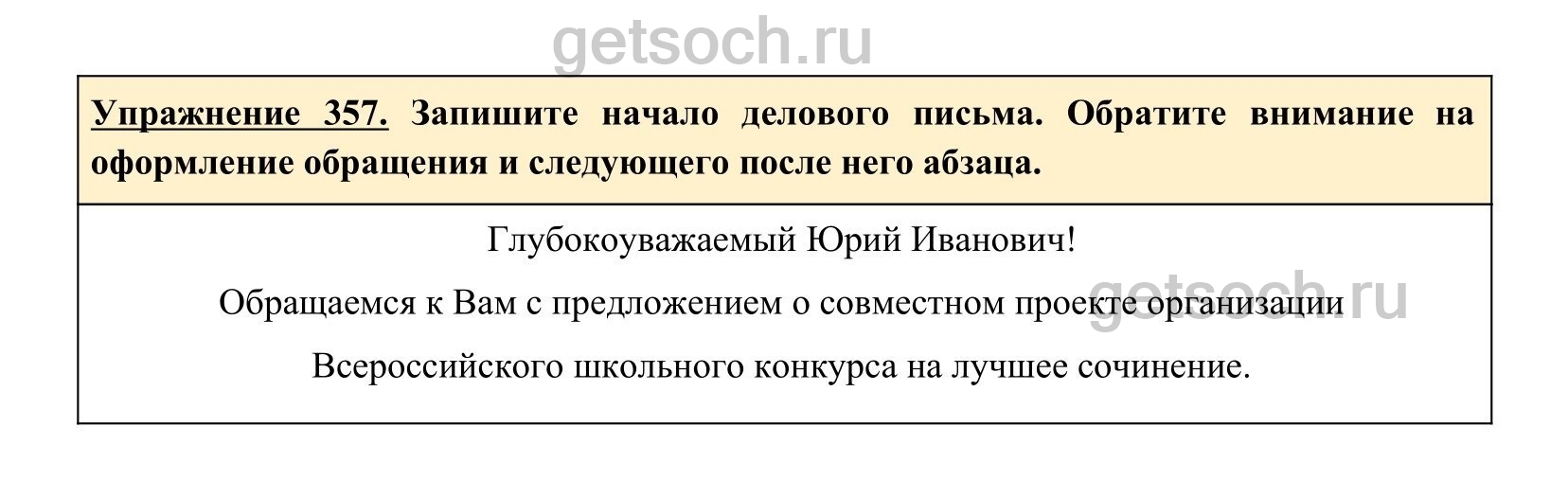 Упражнение 357. Запишите начало делового письма. Обратите внимание на оформление обращения и следующего после него абзаца.