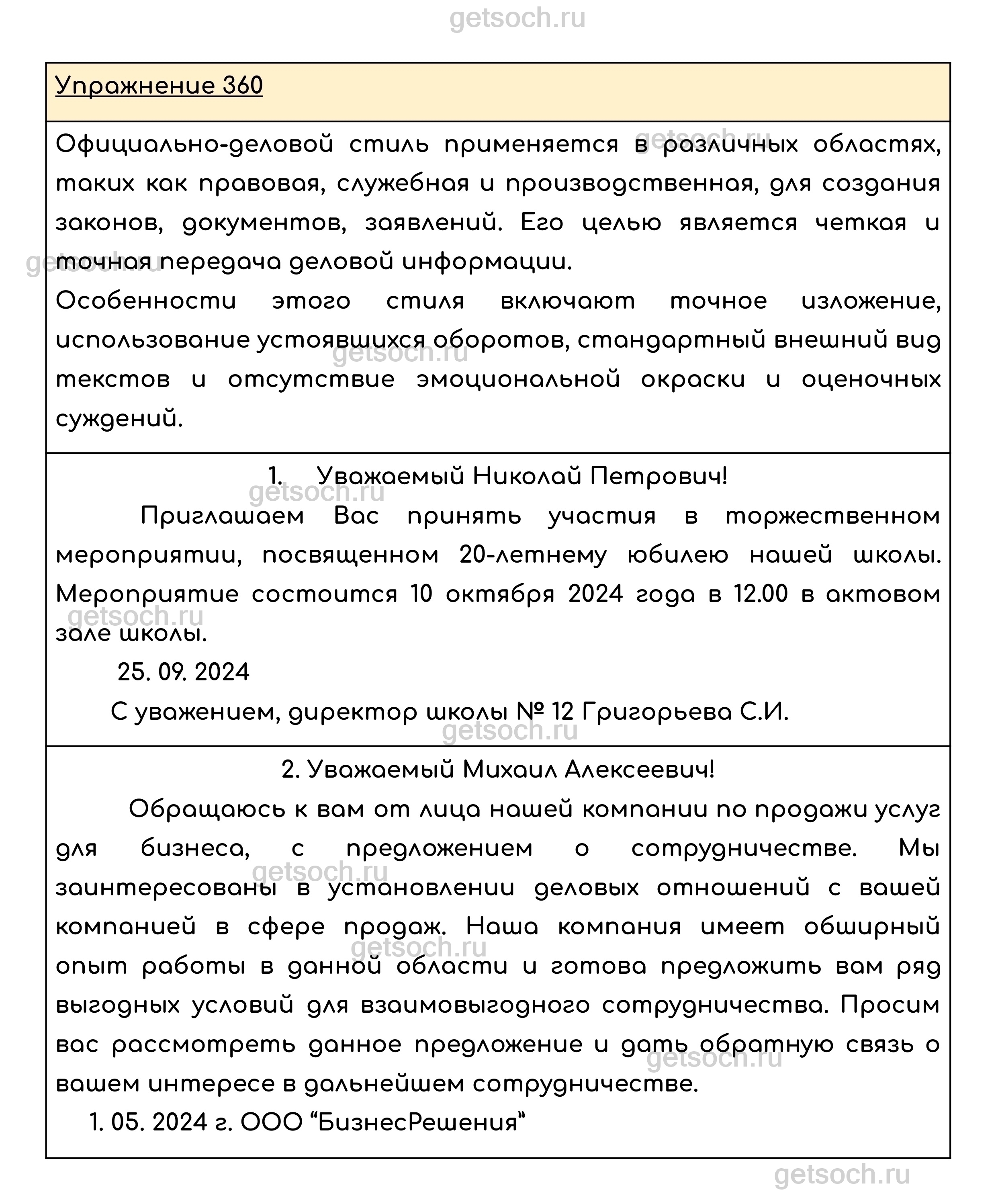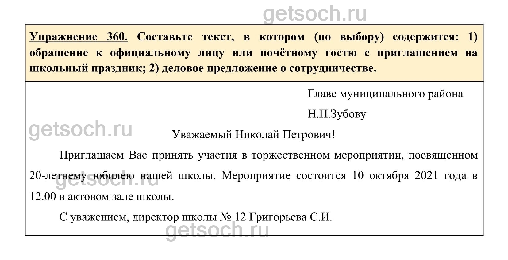 Упражнение 360. Составьте текст, в котором (по выбору) содержится: 1) обращение к официальному лицу или почётному гостю с приглашением на школьный праздник; 2) деловое предложение о сотрудничестве.