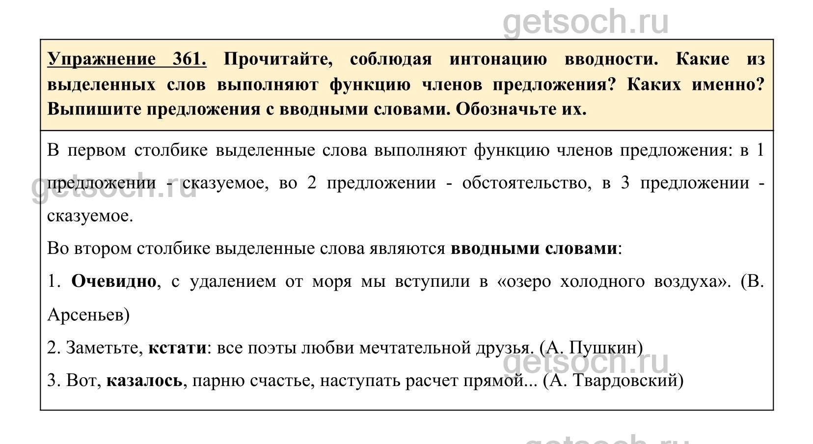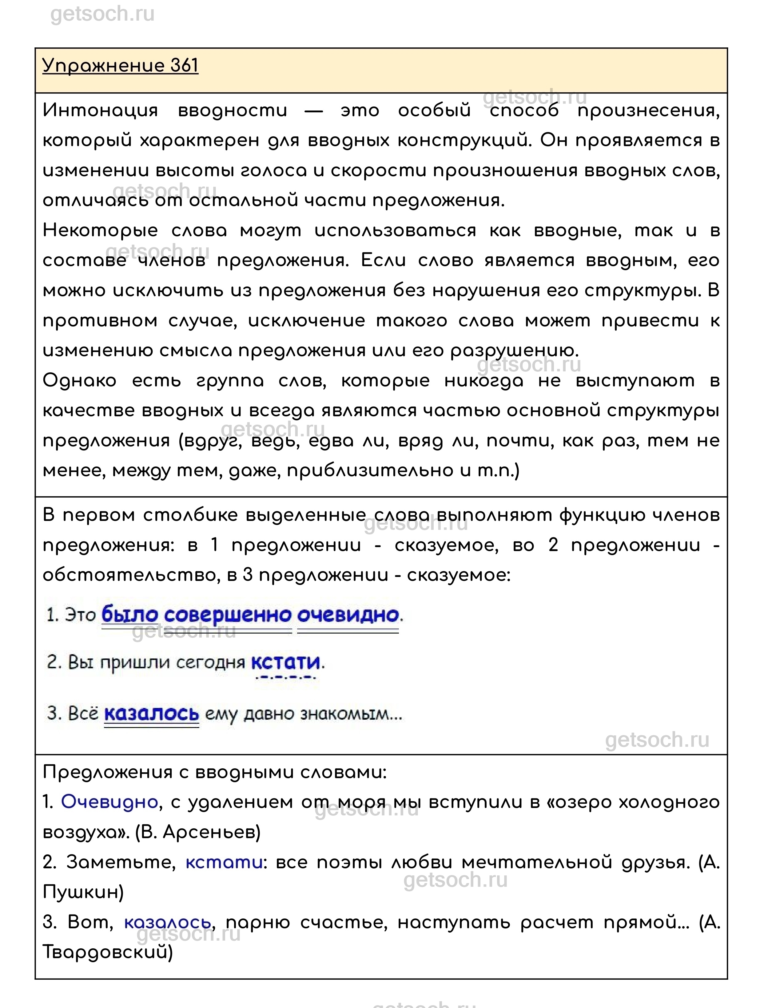 Упражнение 361. Прочитайте, соблюдая интонацию вводности. Какие из выделенных слов выполняют функцию членов предложения? Каких именно? Выпишите предложения с вводными словами. Обозначьте их.