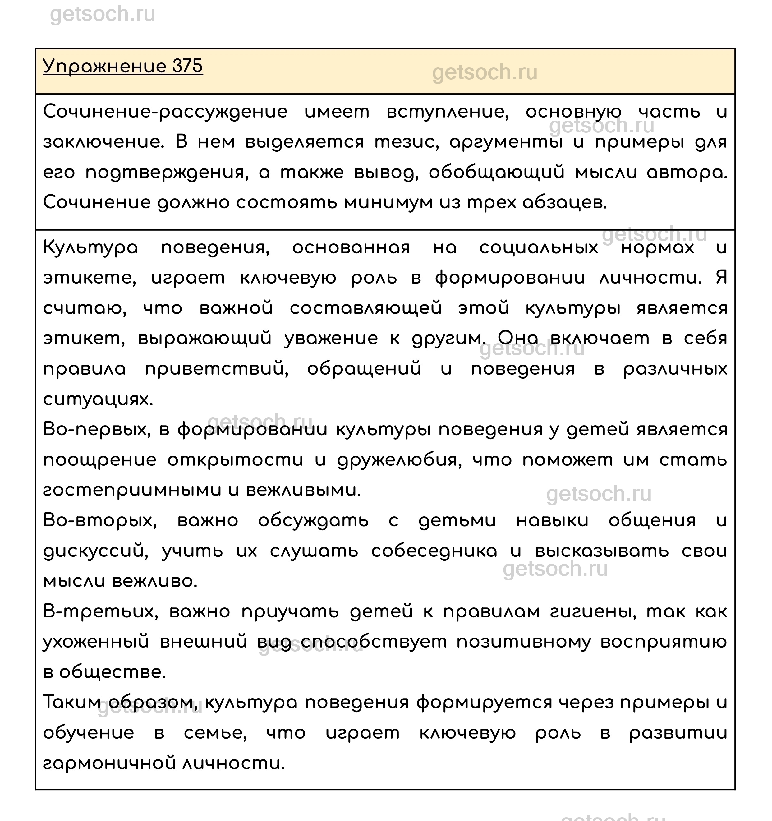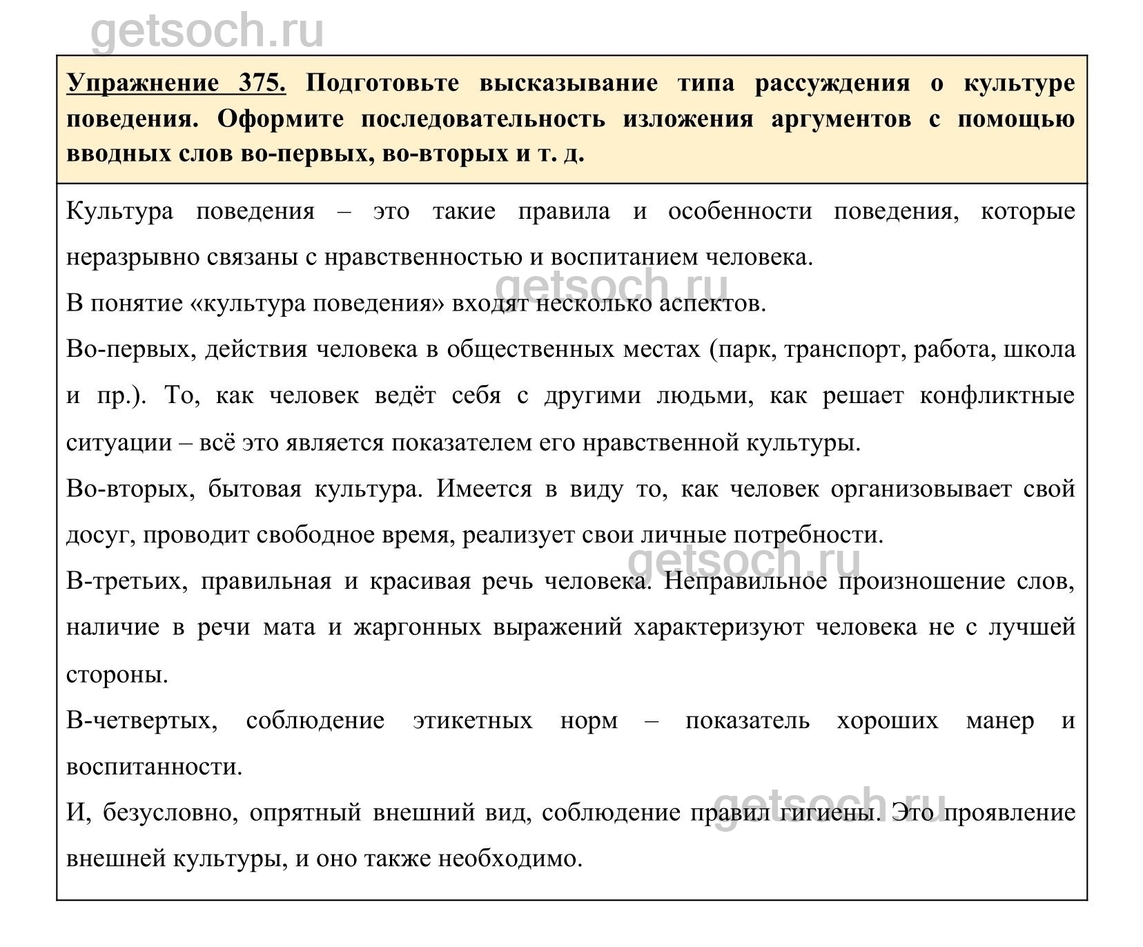 Упражнение 375. Подготовьте высказывание типа рассуждения о культуре поведения. Оформите последовательность изложения аргументов с помощью вводных слов во-первых, во-вторых и т. д.