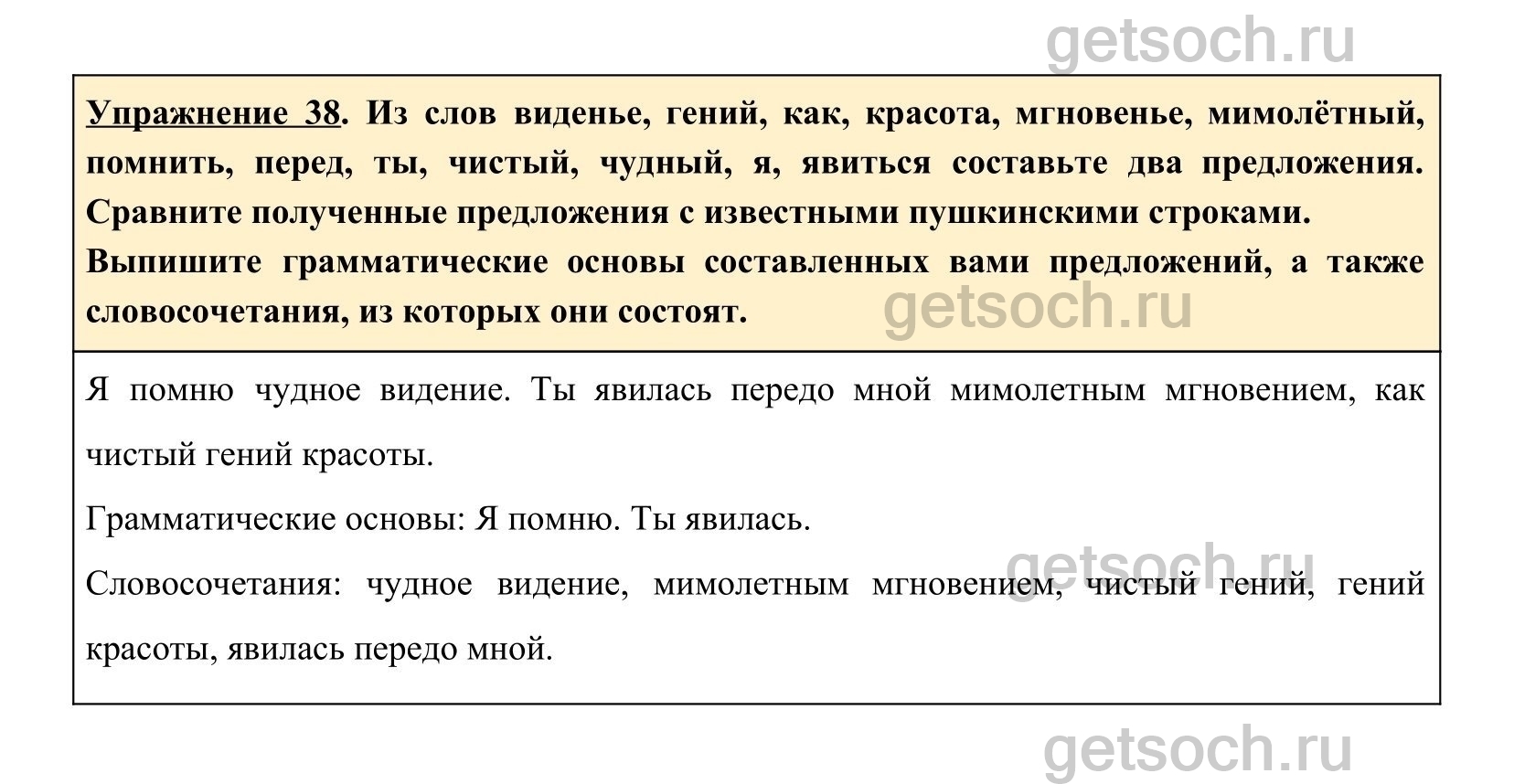 Упражнение 38. Из слов виденье, гений, как, красота, мгновенье, мимолётный, помнить, перед, ты, чистый, чудный, я, явиться составьте два предложения. Сравните полученные предложения с известными пушкинскими строками.
