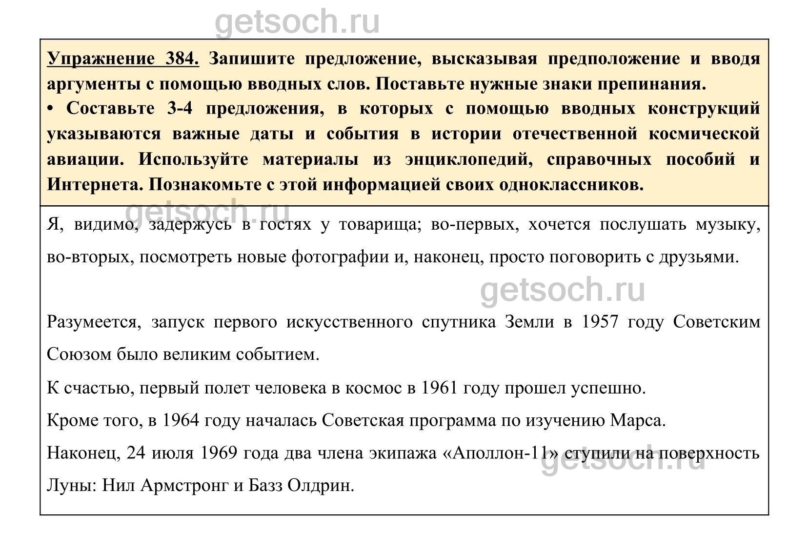 • Составьте 3-4 предложения, в которых с помощью вводных конструкций указываются важные даты и события в истории отечественной космической авиации. Используйте материалы из энциклопедий, справочных пособий и Интернета. Познакомьте с этой информацией своих одноклассников.