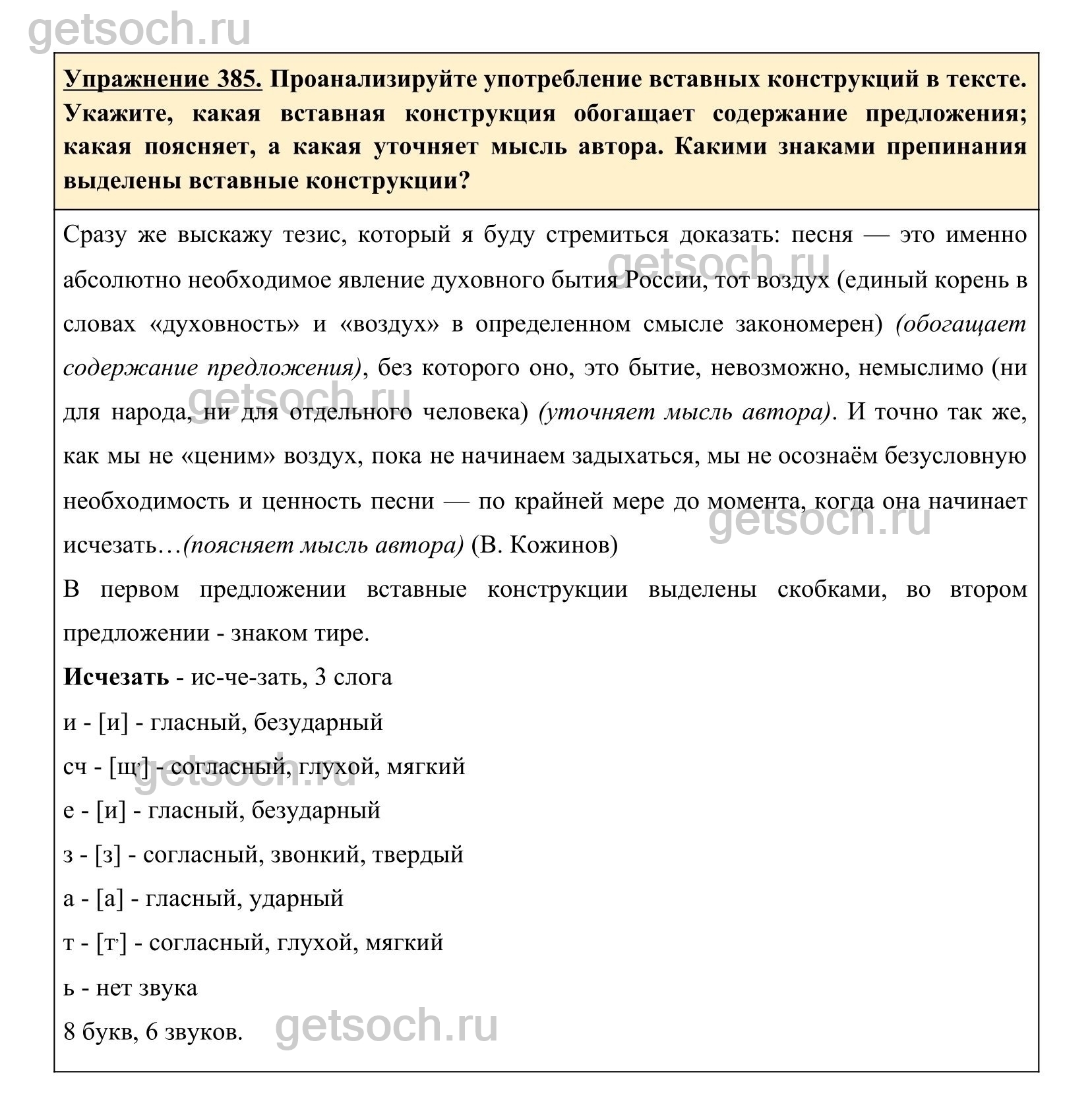 Упражнение 385. Проанализируйте употребление вставных конструкций в тексте. Укажите, какая вставная конструкция обогащает содержание предложения; какая поясняет, а какая уточняет мысль автора. Какими знаками препинания выделены вставные конструкции?