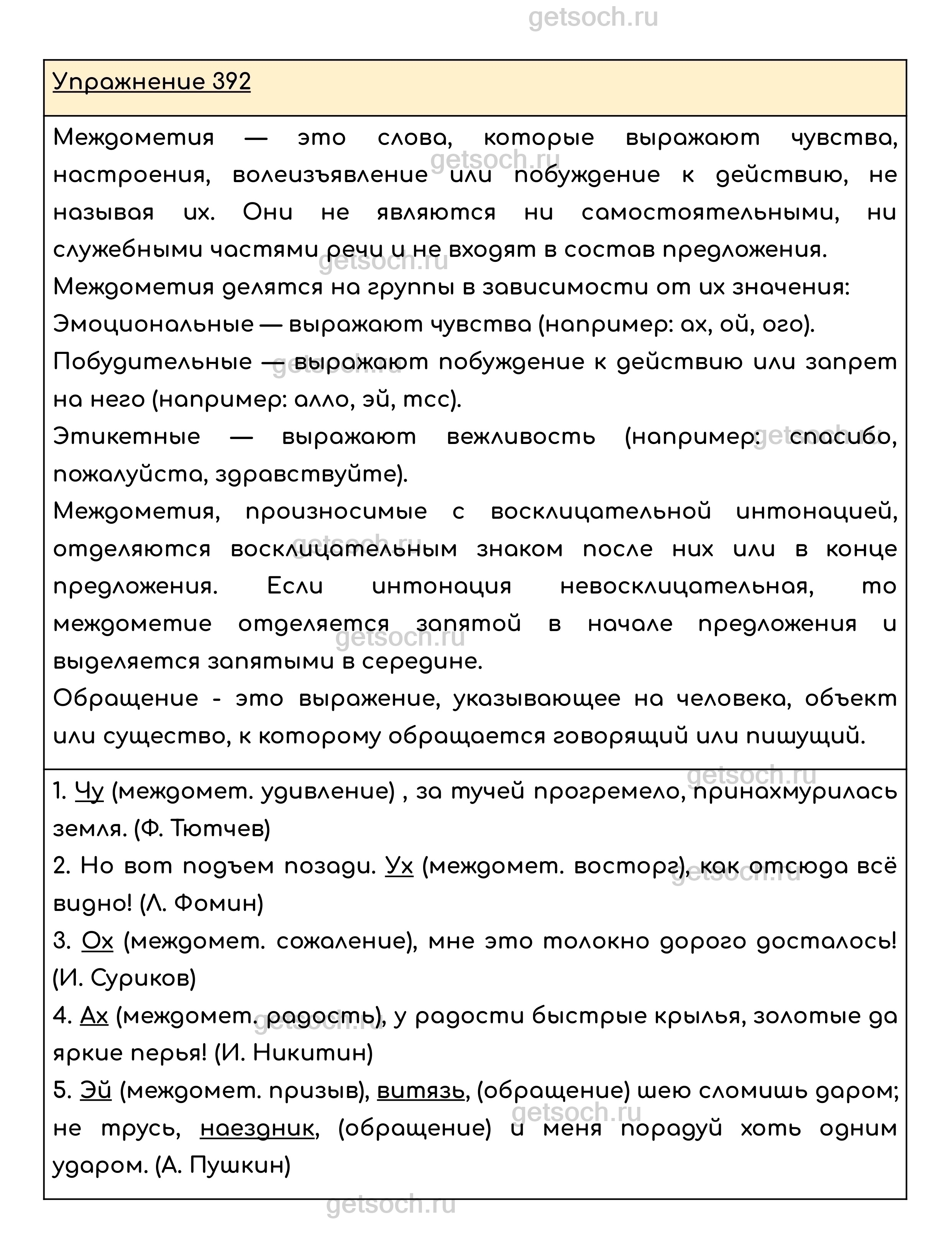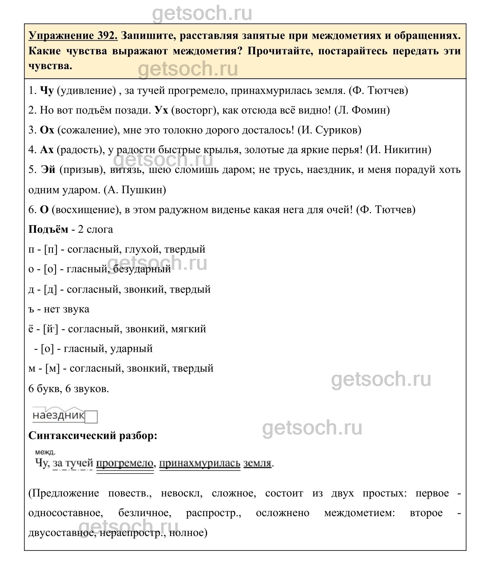 Упражнение 392. Запишите, расставляя запятые при междометиях и обращениях. Какие чувства выражают междометия? Прочитайте, постарайтесь передать эти чувства.