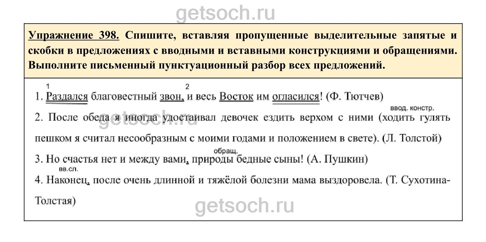 Упражнение 398. Спишите, вставляя пропущенные выделительные запятые и скобки в предложениях с вводными и вставными конструкциями и обращениями. Выполните письменный пунктуационный разбор всех предложений.