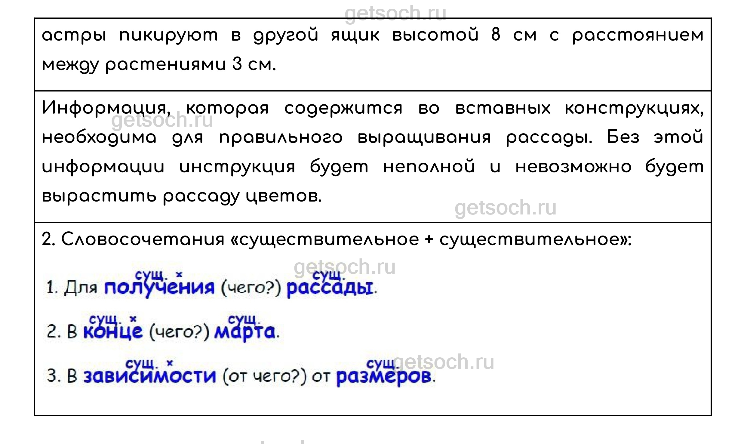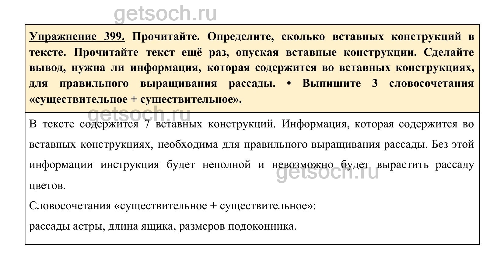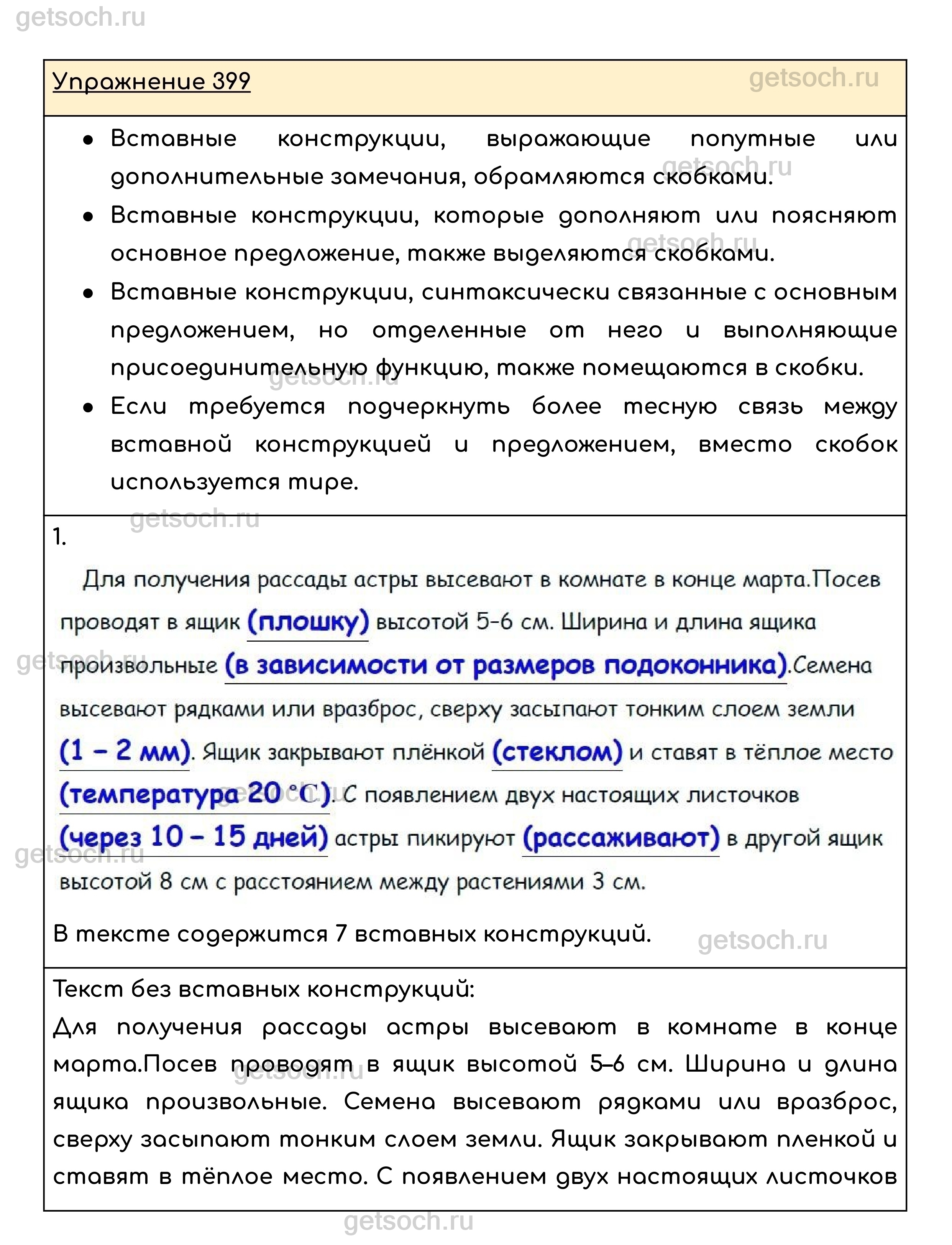 Упражнение 399. Прочитайте. Определите, сколько вставных конструкций в тексте. Прочитайте текст ещё раз, опуская вставные конструкции. Сделайте вывод, нужна ли информация, которая содержится во вставных конструкциях, для правильного выращивания рассады. • Выпишите 3 словосочетания «существительное + существительное».