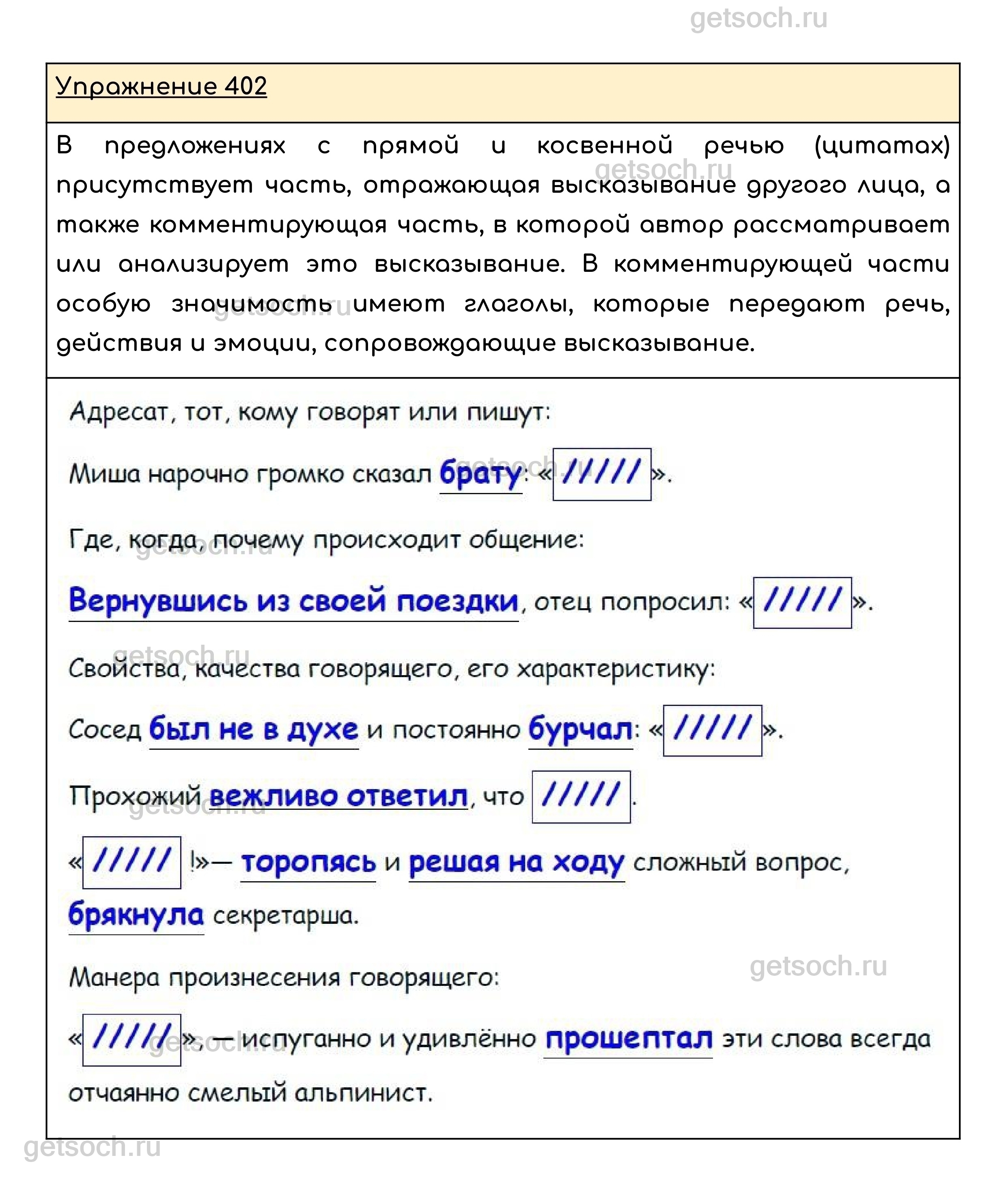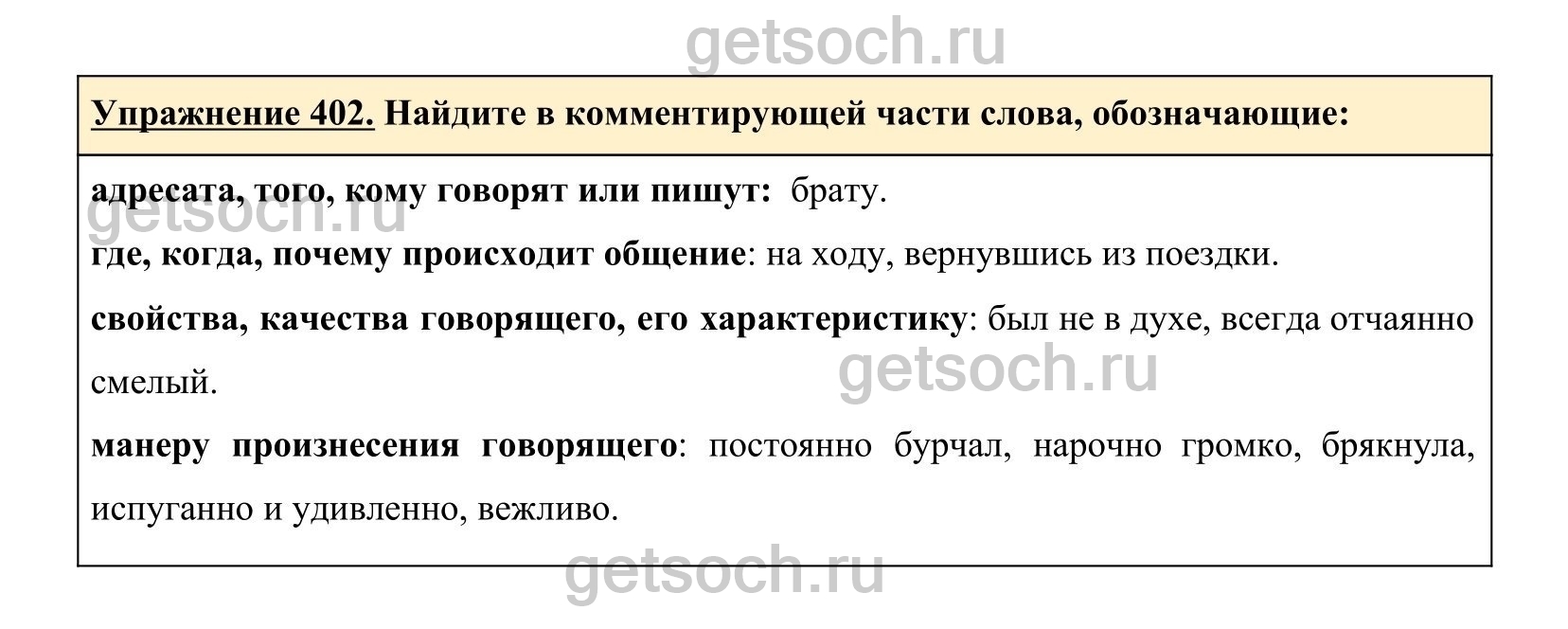 Упражнение 402. Найдите в комментирующей части слова, обозначающие: