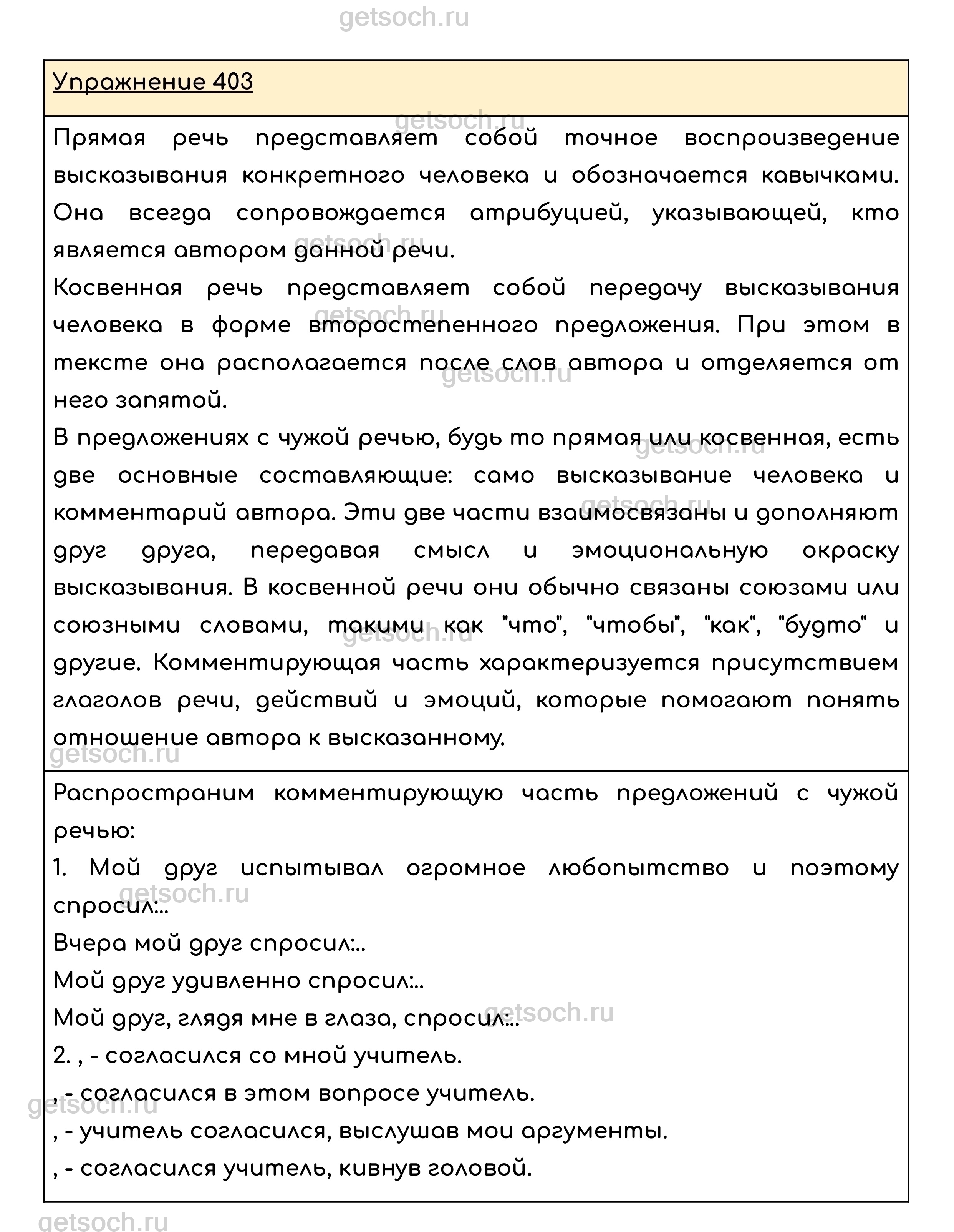 Упражнение 403. Распространите комментирующую часть предложений с чужой речью, взяв за основу данные схемы. Запишите свой вариант этой части. Сами определите порядок слов в комментирующей части и её место (до или после чужой речи).