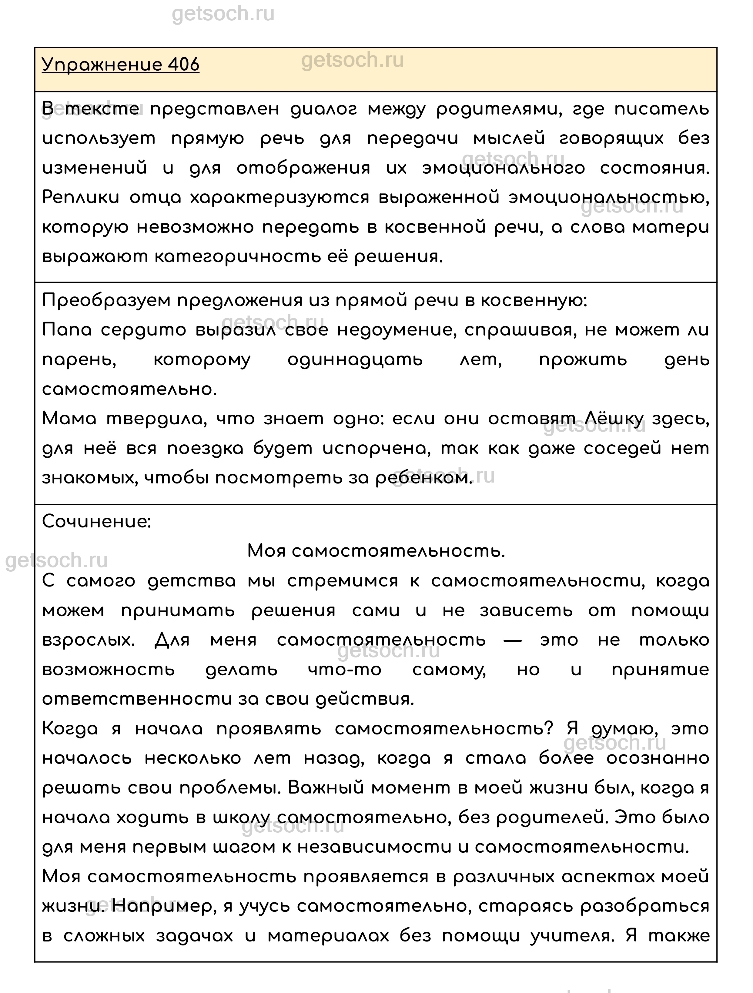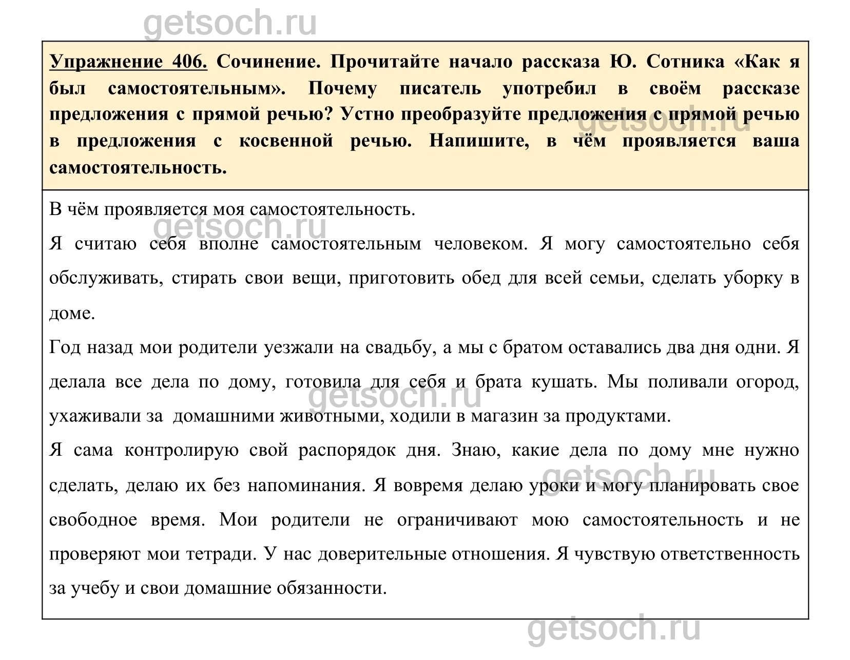 Упражнение 406. Сочинение. Прочитайте начало рассказа Ю. Сотника «Как я был самостоятельным». Почему писатель употребил в своём рассказе предложения с прямой речью? Устно преобразуйте предложения с прямой речью в предложения с косвенной речью. Напишите, в чём проявляется ваша самостоятельность.
