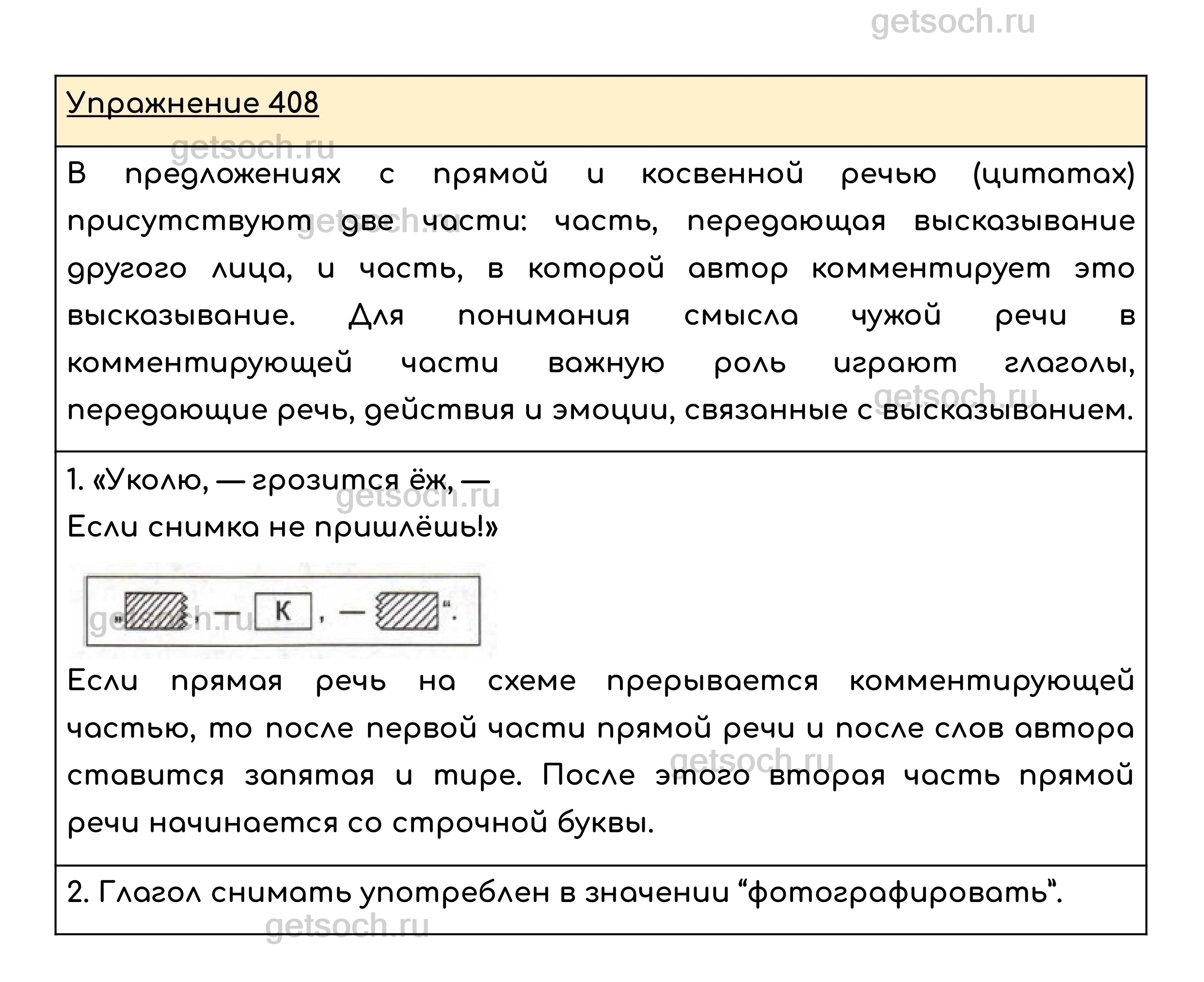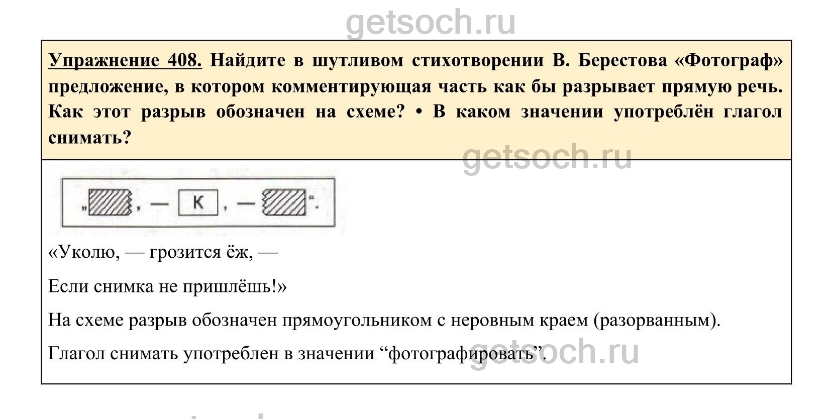Упражнение 408. Найдите в шутливом стихотворении В. Берестова «Фотограф» предложение, в котором комментирующая часть как бы разрывает прямую речь. Как этот разрыв обозначен на схеме? • В каком значении употреблён глагол снимать?