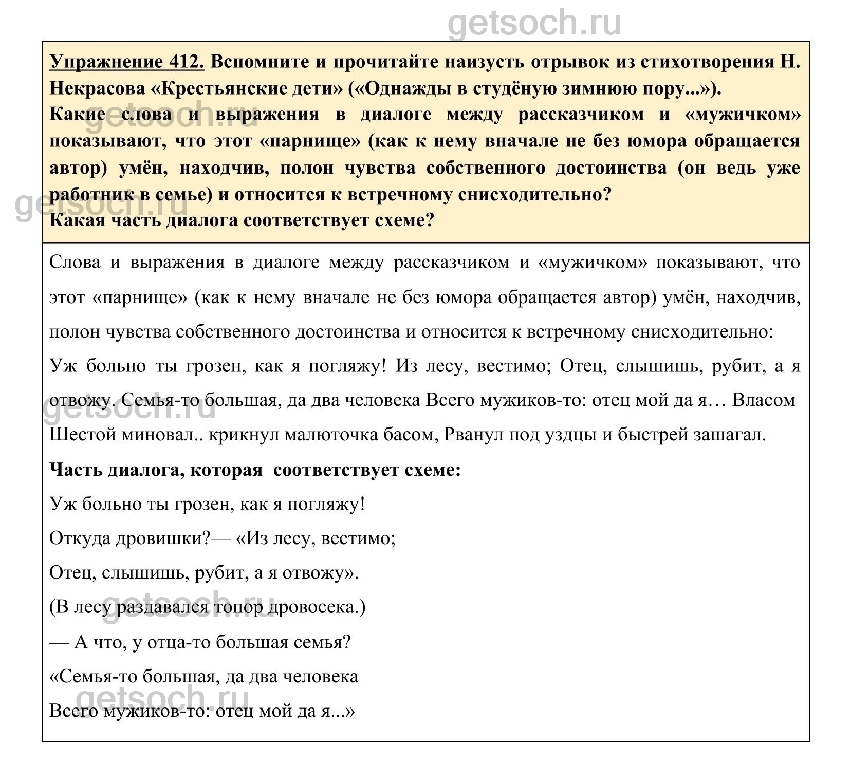 Упражнение 412. Вспомните и прочитайте наизусть отрывок из стихотворения Н. Некрасова «Крестьянские дети» («Однажды в студёную зимнюю пору…»).