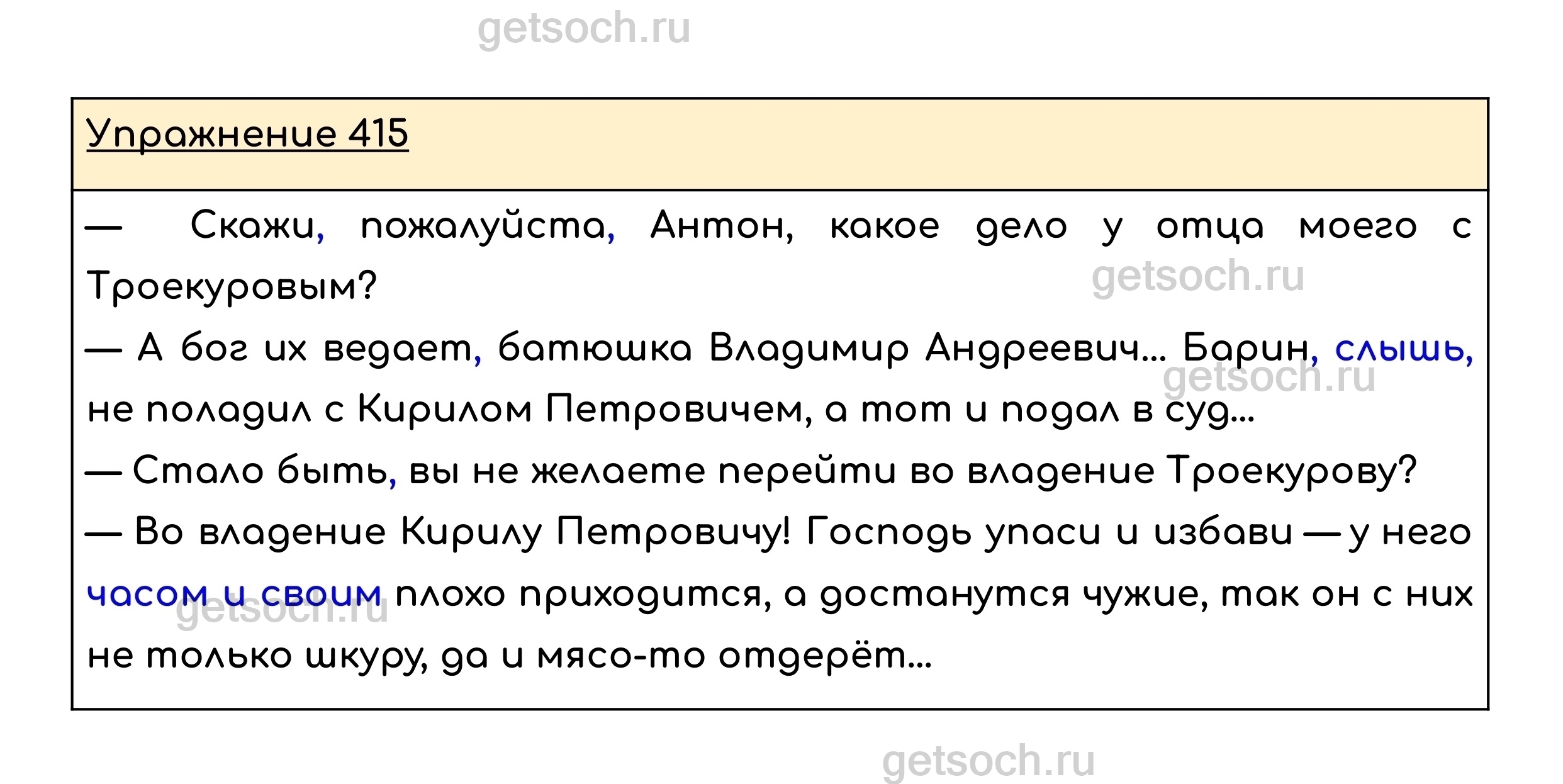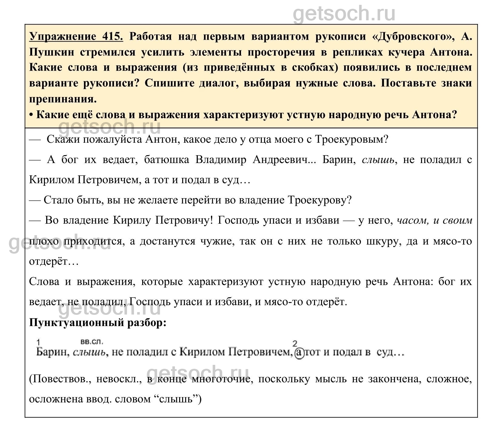 Упражнение 415. Работая над первым вариантом рукописи «Дубровского», А. Пушкин стремился усилить элементы просторечия в репликах кучера Антона. Какие слова и выражения (из приведённых в скобках) появились в последнем варианте рукописи? Спишите диалог, выбирая нужные слова. Поставьте знаки препинания.