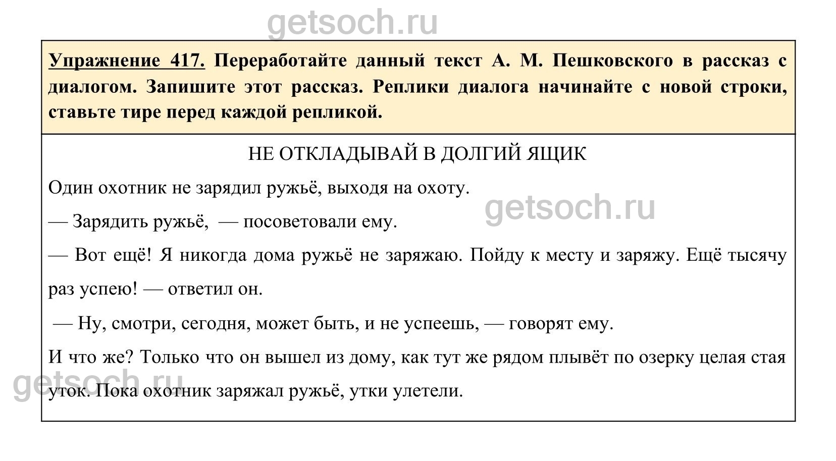 Упражнение 417. Переработайте данный текст А. М. Пешковского в рассказ с диалогом. Запишите этот рассказ. Реплики диалога начинайте с новой строки, ставьте тире перед каждой репликой.