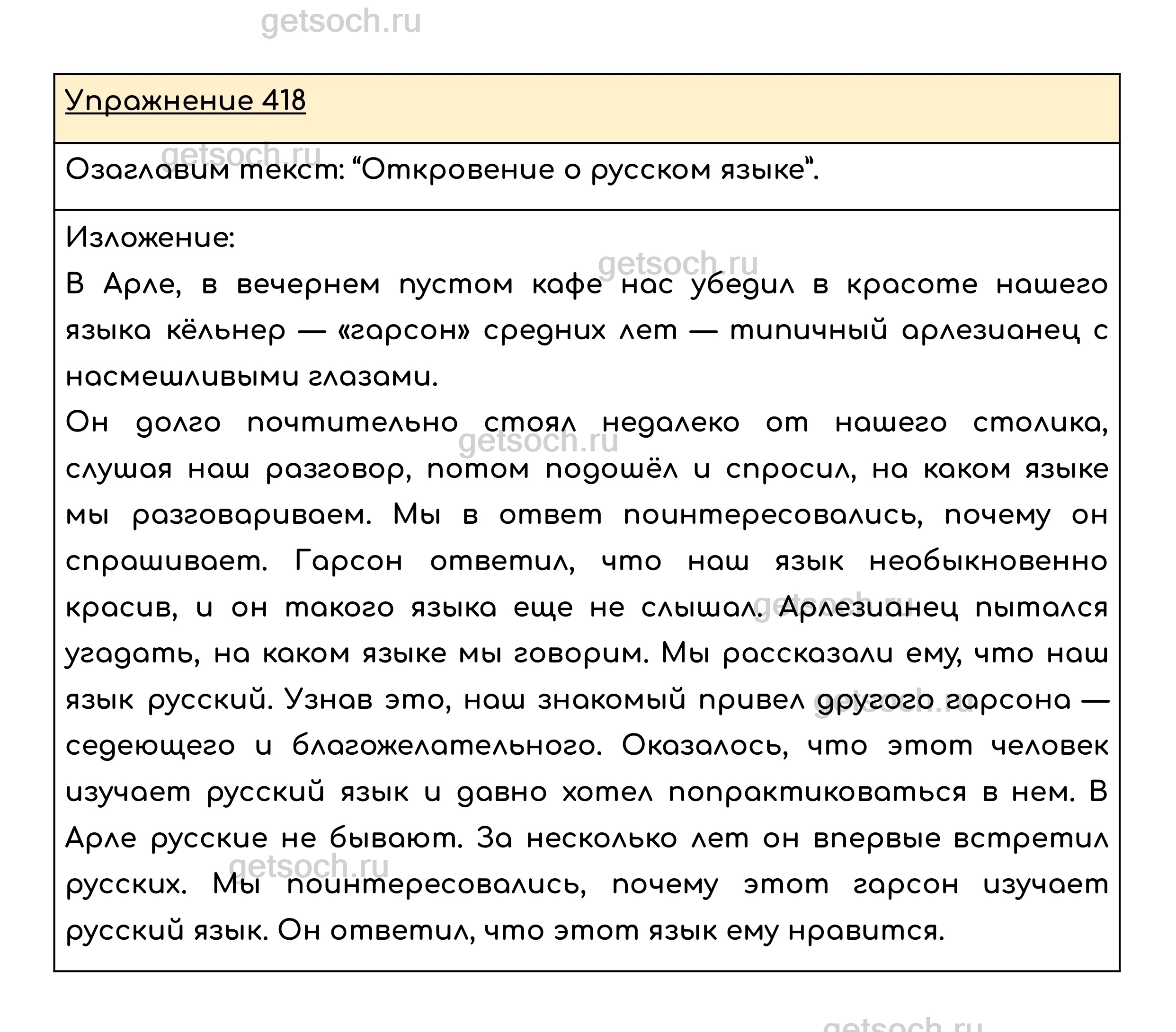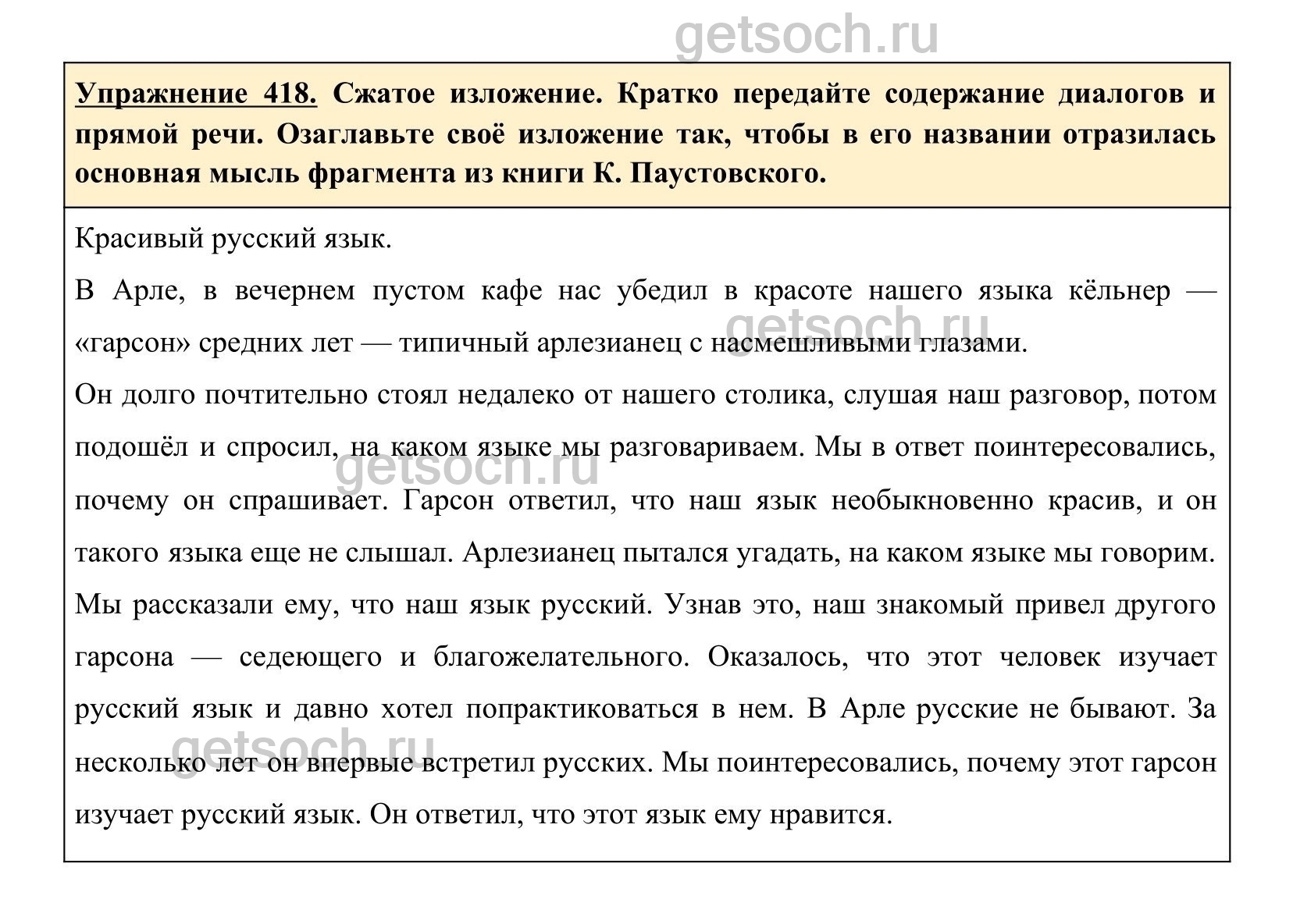 Упражнение 418. Сжатое изложение. Кратко передайте содержание диалогов и прямой речи. Озаглавьте своё изложение так, чтобы в его названии отразилась основная мысль фрагмента из книги К. Паустовского.