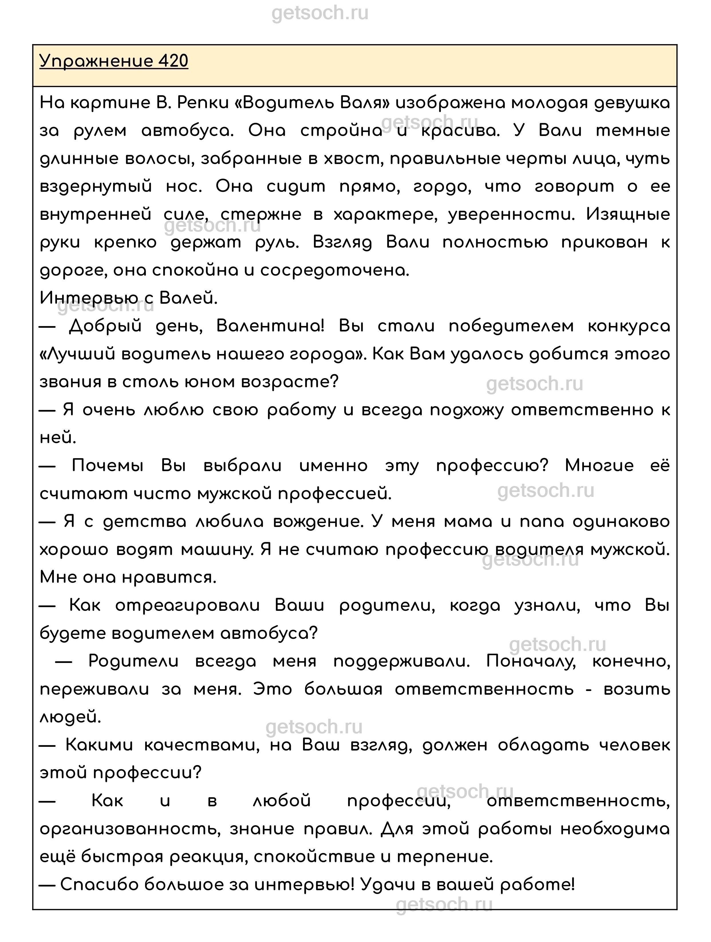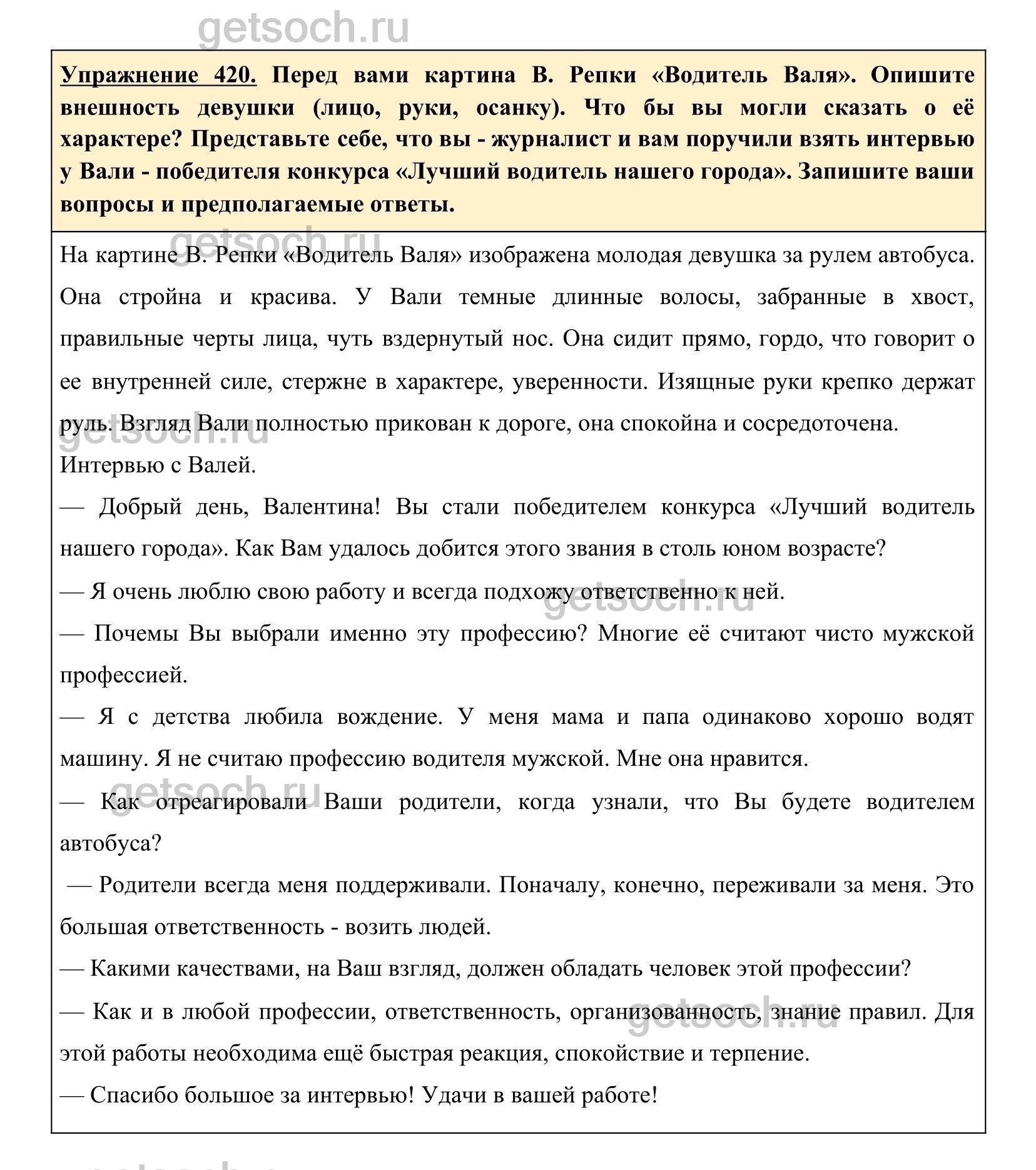 Упражнение 420. Перед вами картина В. Репки «Водитель Валя». Опишите внешность девушки (лицо, руки, осанку). Что бы вы могли сказать о её характере? Представьте себе, что вы – журналист и вам поручили взять интервью у Вали – победителя конкурса «Лучший водитель нашего города». Запишите ваши вопросы и предполагаемые ответы.