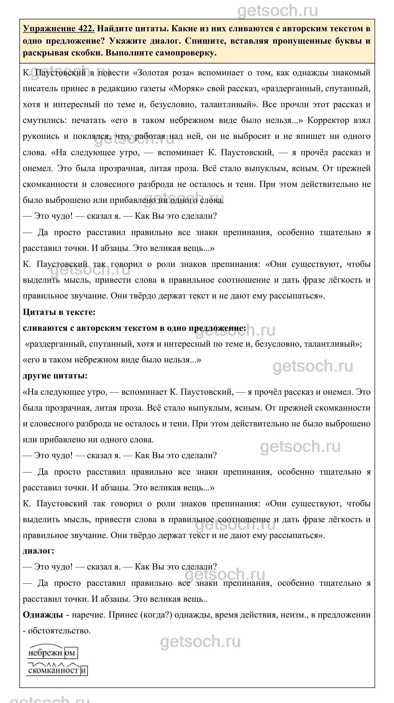 Упражнение 422. Найдите цитаты. Какие из них сливаются с авторским текстом в одно предложение? Укажите диалог. Спишите, вставляя пропущенные буквы и раскрывая скобки. Выполните самопроверку.