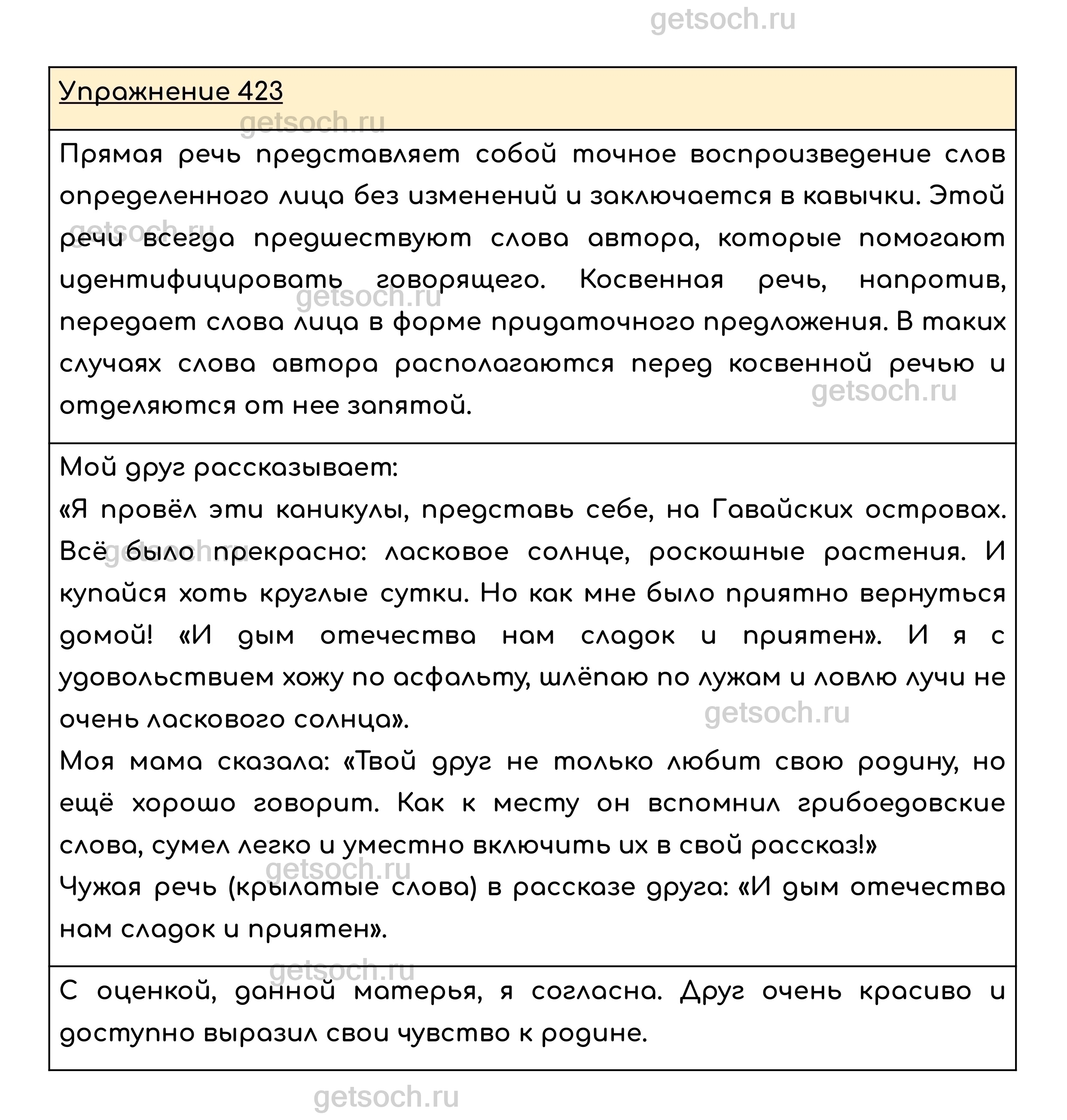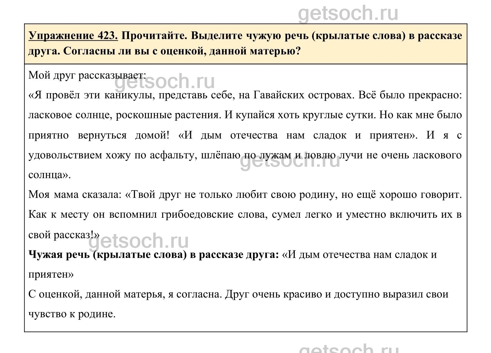 Упражнение 423. Прочитайте. Выделите чужую речь (крылатые слова) в рассказе друга. Согласны ли вы с оценкой, данной матерью?