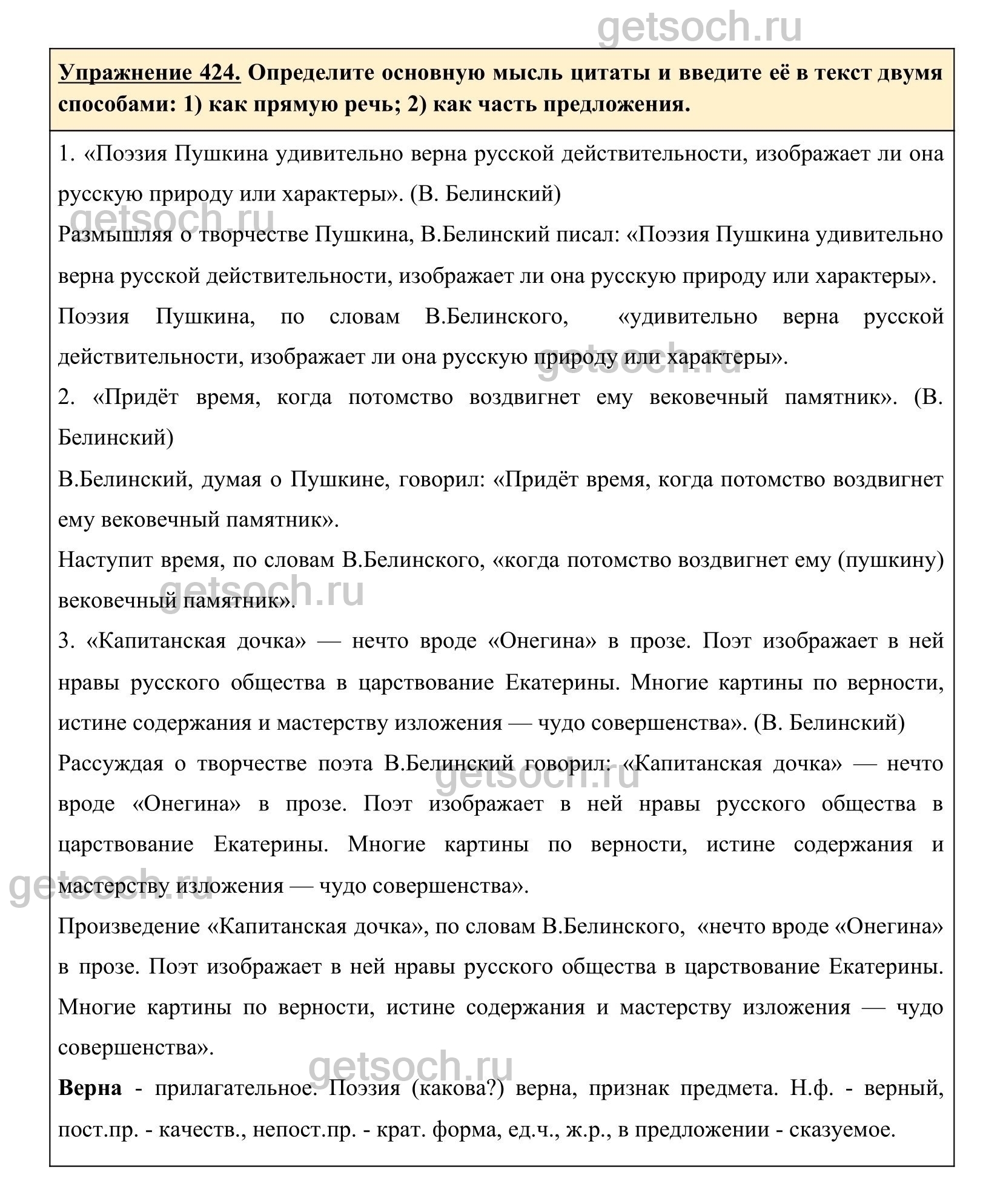 Упражнение 424. Определите основную мысль цитаты и введите её в текст двумя способами: 1) как прямую речь; 2) как часть предложения.
