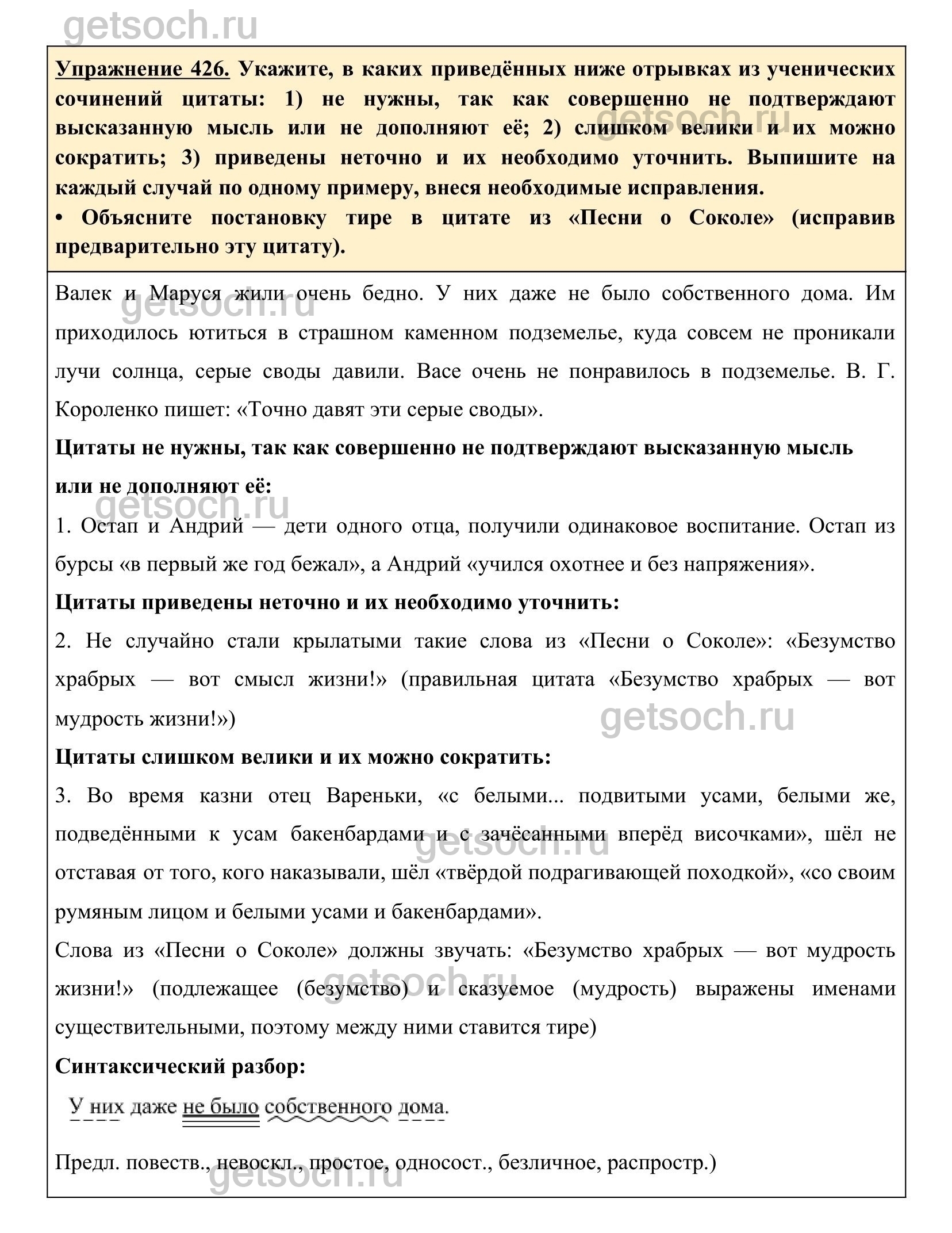 Упражнение 426. Укажите, в каких приведённых ниже отрывках из ученических сочинений цитаты: 1) не нужны, так как совершенно не подтверждают высказанную мысль или не дополняют её; 2) слишком велики и их можно сократить; 3) приведены неточно и их необходимо уточнить. Выпишите на каждый случай по одному примеру, внеся необходимые исправления.